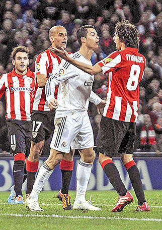 في فبراير 2014، حصل رونالدو على بطاقة حمراء مباشرة أخرى بعد تورطه في مواجهة مع لاعبي أتلتيك بيلباو، واندلع شجار بينما كان الفريقان ينتظران تسديد ركلة ثابتة، وكانت النتيجة 1-1 قبل 20 دقيقة من نهاية المباراة، وكتب الحكم ميجيل أنخيل جاميز في تقريره أن رونالدو ضرب أحد المنافسين في الوجه.