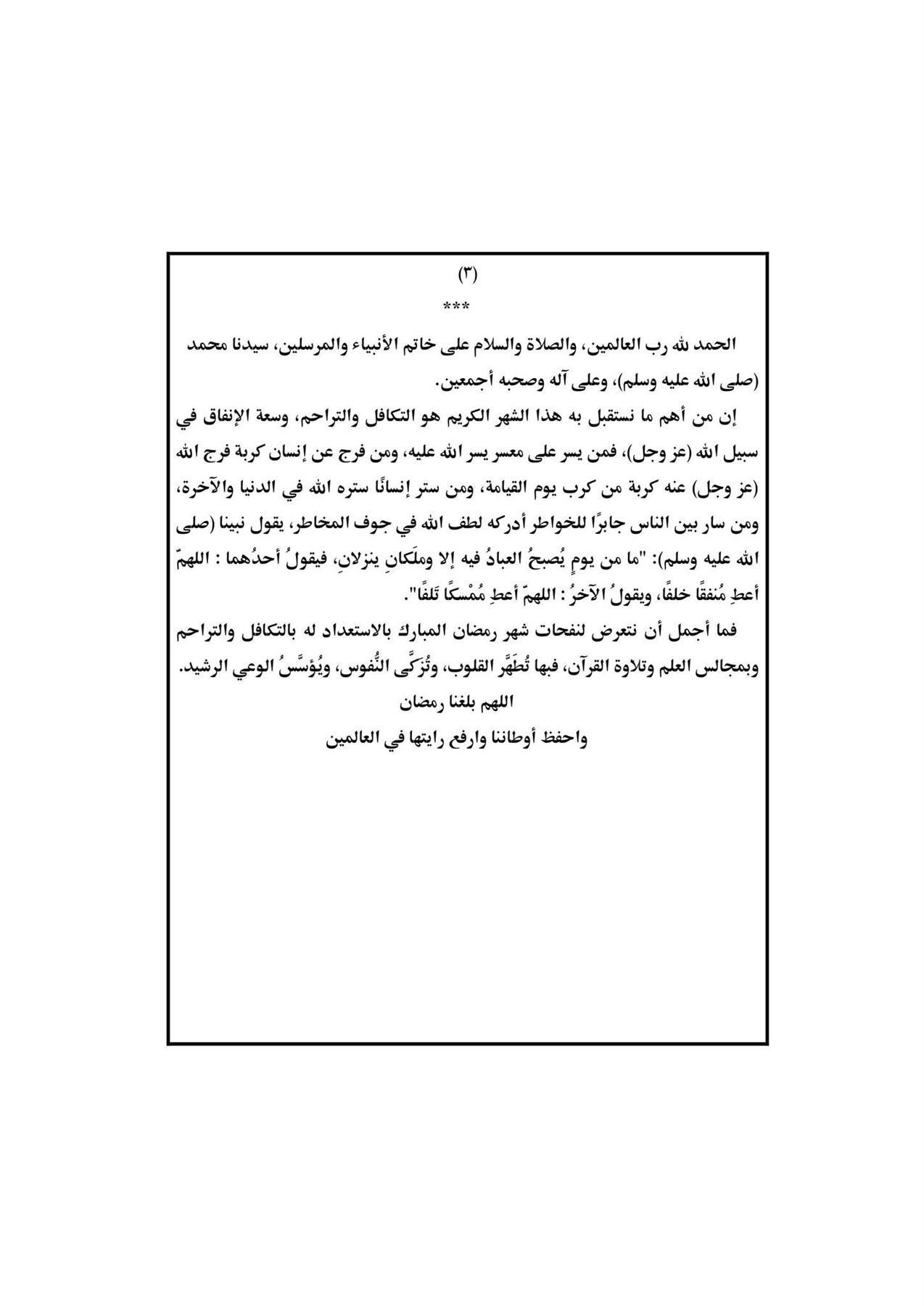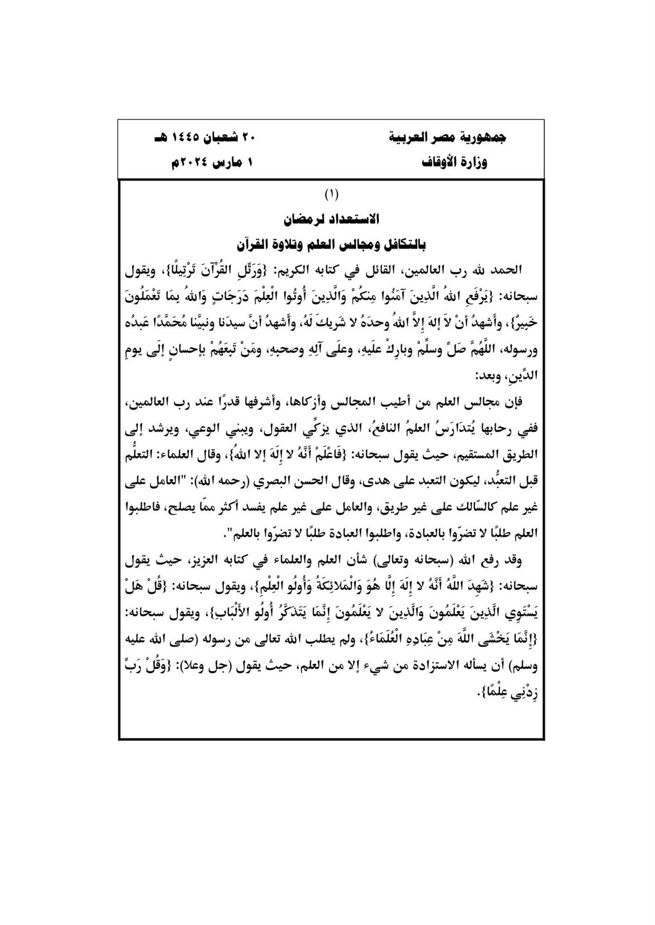 حددت وزارة الأوقاف موضوع خطبة اليوم الجمعة تحت عنوان "الاستعداد لرمضان.. بالتكافل ومجالس العلم وتلاوة القرآن".