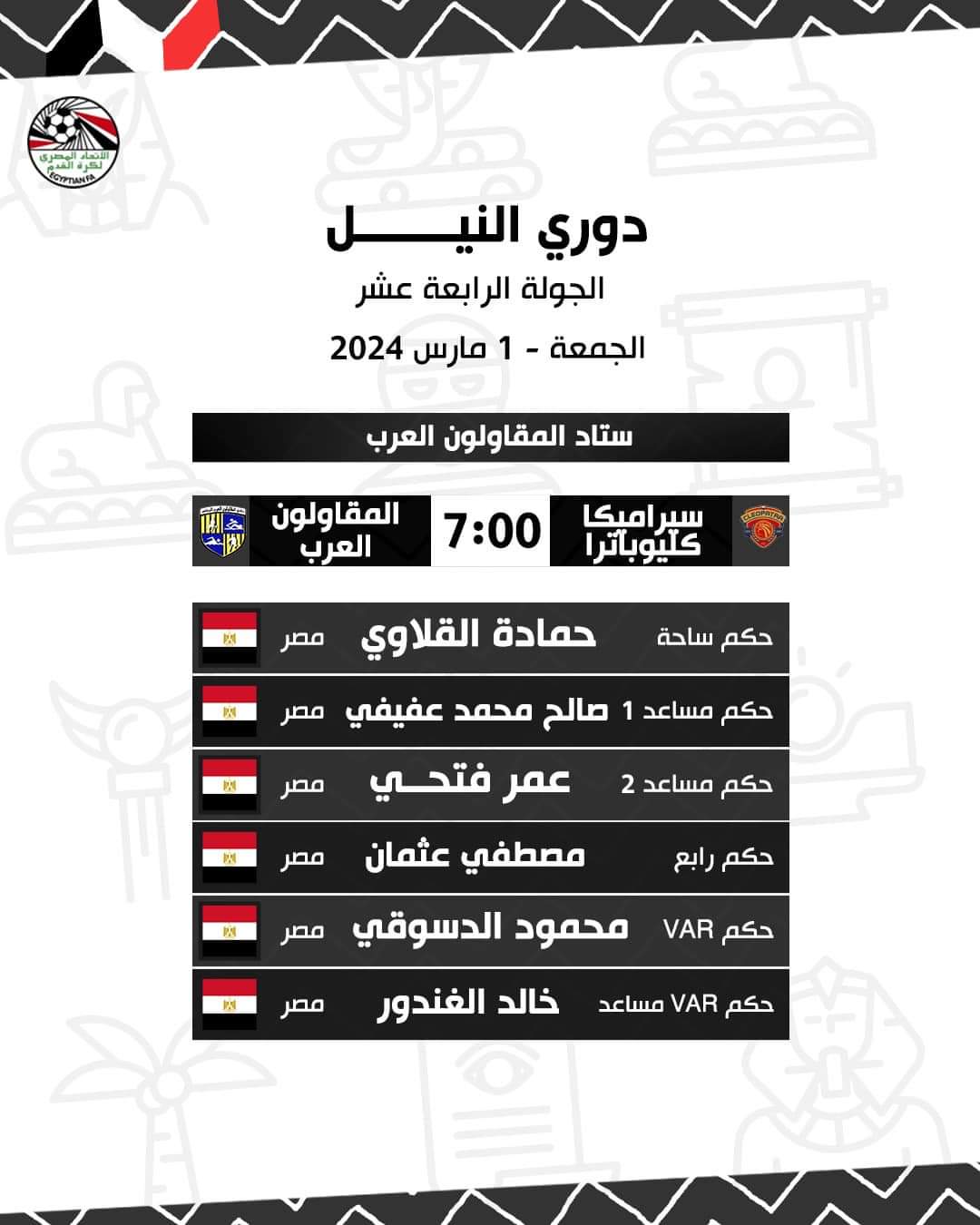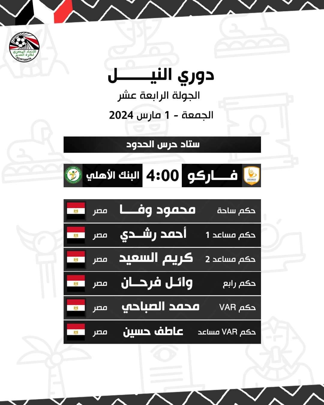 الدوري المصري، اختارت لجنة الحكام حكام مباراتي المقاولون العرب وسيراميكا وفاركو أمام البنك الأهلي الجولة الـ١٢ من الدوري الممتاز.