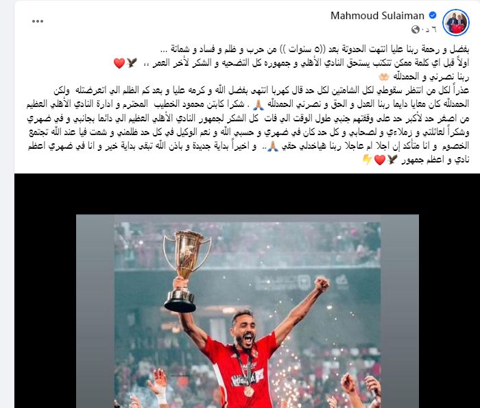 وتابع: “عذرًا لكل من انتظر سقوطي لكل الشامتين لكل حد قال كهربا انتهى بفضل الله وكرمه عليا وبعد كم الظلم اللي اتعرضتله ولكن الحمدلله كان معايا دايما ربنا العدل والحق ونصرني الحمدلله.. شكرا كابتن محمود الخطيب المحترم وإدارة النادي الأهلي العظيم من أصغر حد لأكبر حد على وقفتهم جنبي طول الوقت اللي فات كل الشكر لجمهور النادي الأهلي العظيم اللي دائما بجانبي وفي ضهري وشكرًا لعائلتي وزملائي ولصحابي وكل حد كان في ضهري وحسبي الله ونعم الوكيل في كل حد ظلمني وشمت فيا عند الله تجتمع الخصوم وأنا متأكد إن آجلا أم عاجلا ربنا هياخدلي حقي”.