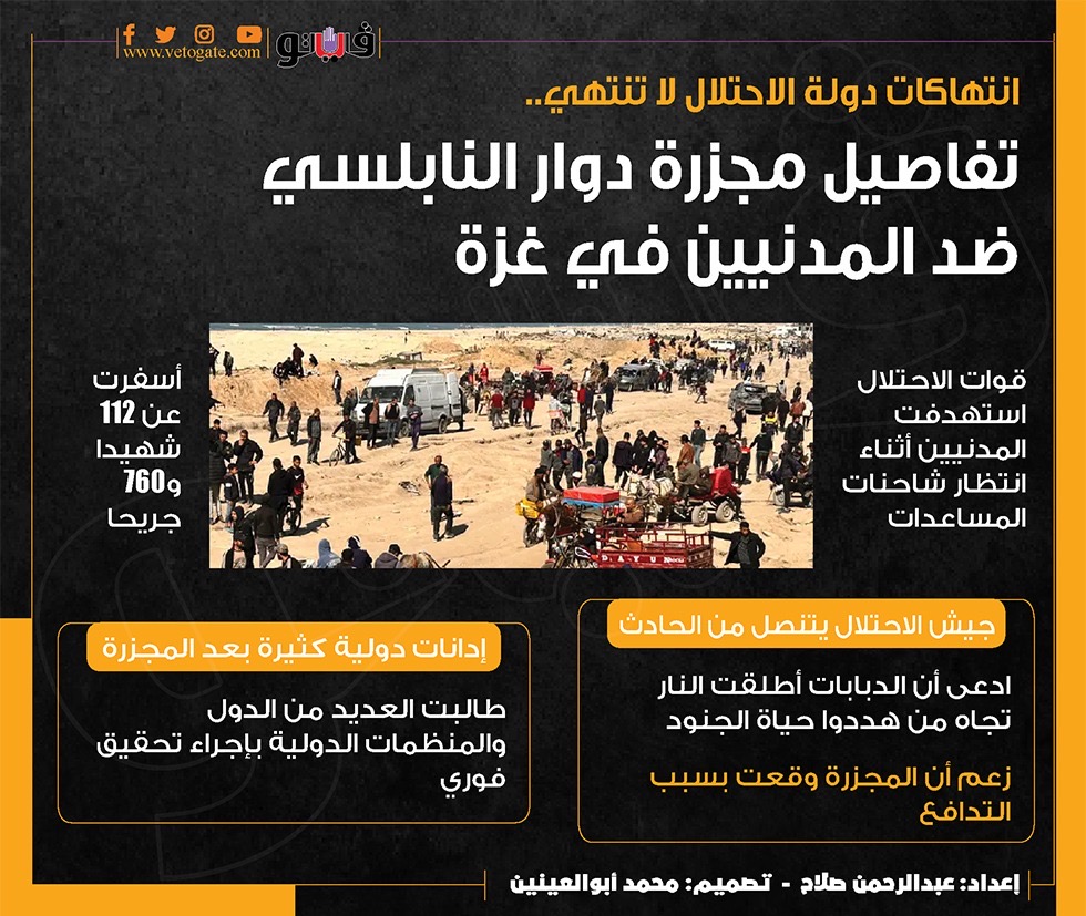 انتهاكات دولة الاحتلال لا تنتهي.. تفاصيل مجزرة دوار النابلسي ضد المدنيين في غزة (إنفوجراف) الجمعة 01/مارس/2024 - 06:31 م 3/1/2024 6:31:47 PM مجزرة دوار النابلسي، فيتو عبدالرحمن صلاح شارك طباعة 18 حجم الخط شارك طباعة غزة قطاع غزة طوفان الأقصى فلسطين مجزرة دوار النابلسي مجازر الاحتلال