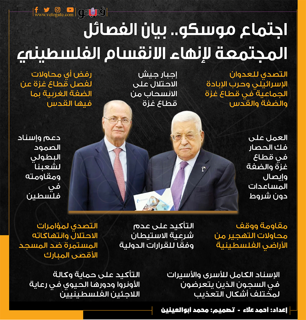 اجتماع موسكو، بيان الفصائل المجتمعة لإنهاء الانقسام الفلسطيني (إنفوجراف) الجمعة 01/مارس/2024 - 02:35 م 3/1/2024 2:35:52 PM اجتماع موسكو، فيتو احمد علاء شارك طباعة 18 حجم الخط شارك طباعة اجتماع موسكو إنهام الإنقسام الفلسطيني الولايات المتحده الامريكيه غزة المسجد الأقصى القدس