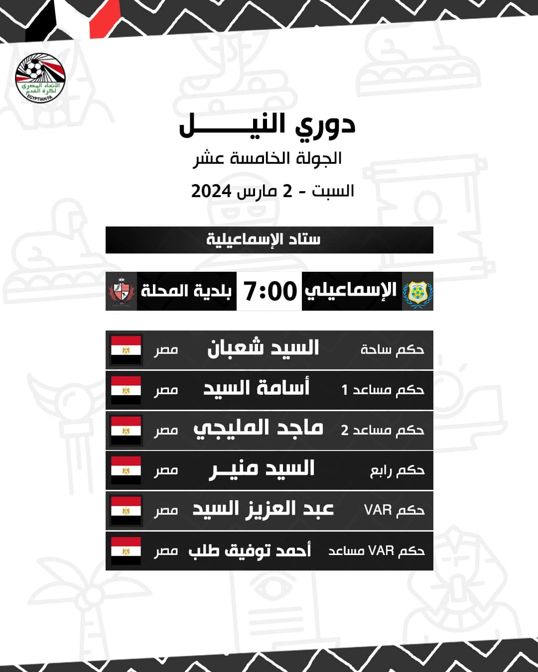 تنطلق مباراة الإسماعيلي مع بلدية المحلة في تمام السابعة مساء غد الأحد، ويديرها السيد شعبان حكما للساحة ويعاونه كل من أسامة السيد مساعد أول وماجد المليجي مساعد ثاني والسيد منير حكما رابعا، وعبدالعزيز السيد حكم فيديو، وأحمد توفيق طلب حكم فيديو مساعد.