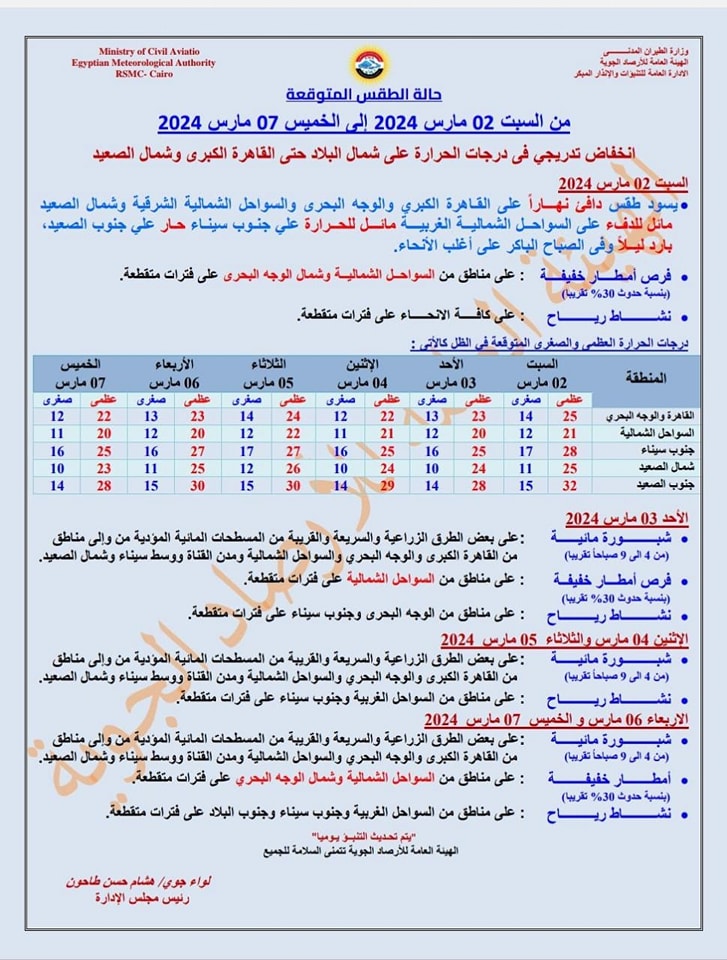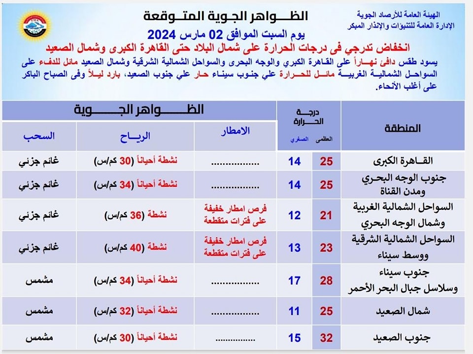 ونشرت هيئة الأرصاد بيانًا بالظواهر الجوية ودرجات الحرارة المتوقعة من اليوم السبت حتى الخميس الموافق 7 مارس الجاري، وجاءت كالتالي: