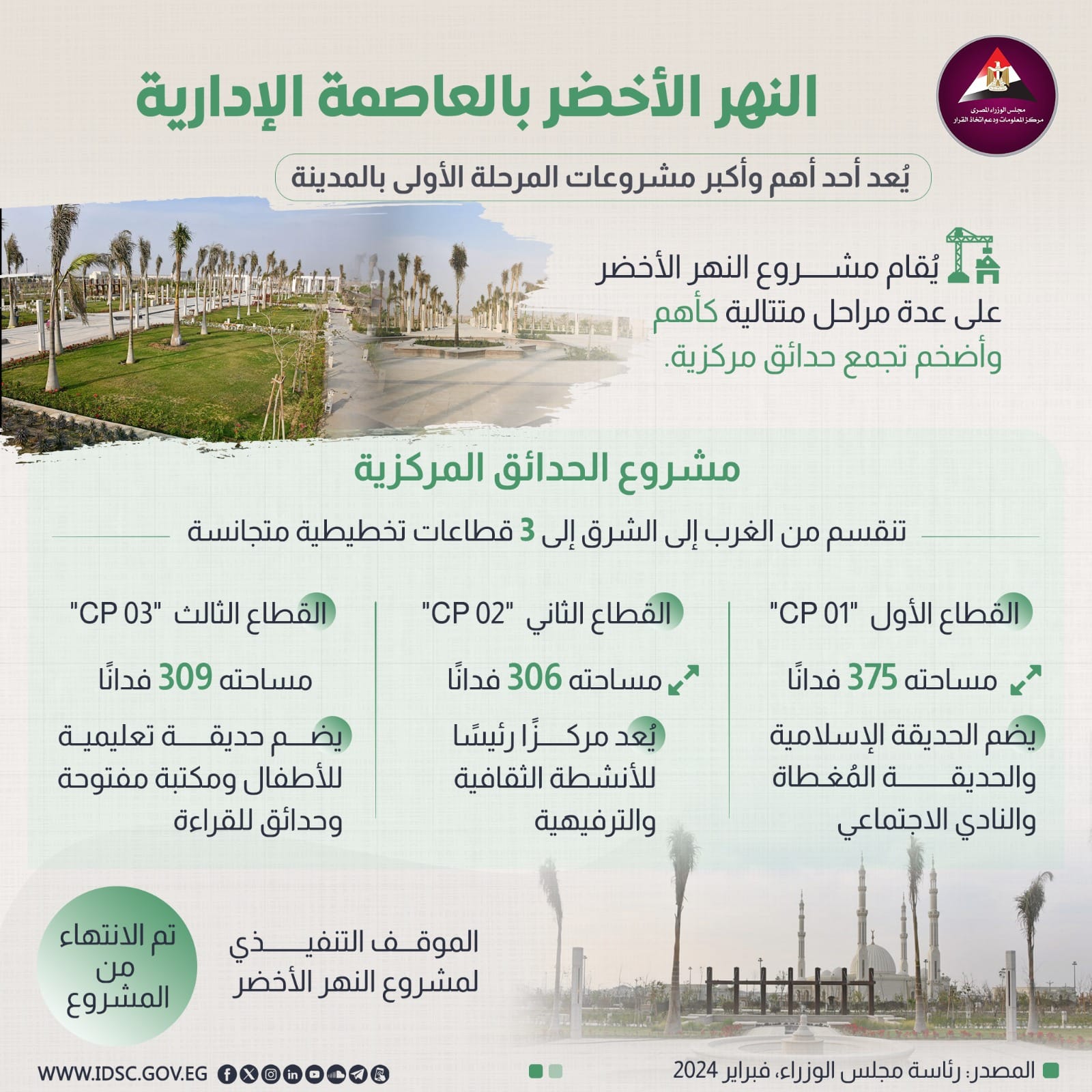 نشرت الصفحة الرسمية لمركز المعلومات ودعم اتخاذ القرار بمجلس الوزراء على موقع التواصل الاجتماعي "فيسبوك" إنفوجراف جديدا تحت عنوان (النهر الأخضر.. تفاصيل مشروع الحدائق المركزية بالعاصمة الإدارية قبل تشغيلها تجريبا).