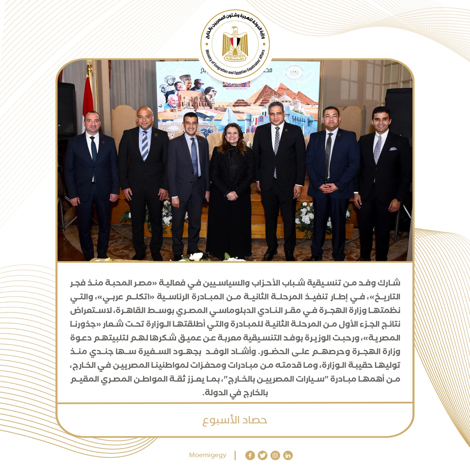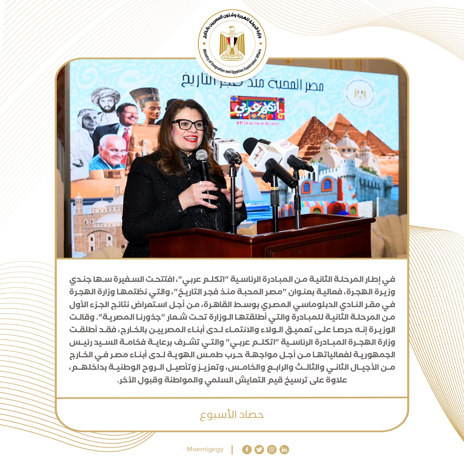 6- في إطار المرحلة الثانية من المبادرة الرئاسية "اتكلم عربي"، افتتحت السفيرة سها جندي وزيرة الهجرة، فعالية بعنوان "مصر المحبة منذ فجر التاريخ"، والتي نظتمها وزارة الهجرة في مقر النادي الدبلوماسي المصري بوسط القاهرة، من أجل استعراض نتائج الجزء الأول من المرحلة الثانية للمبادرة والتي أطلقتها الوزارة تحت شعار "جذورنا المصرية".