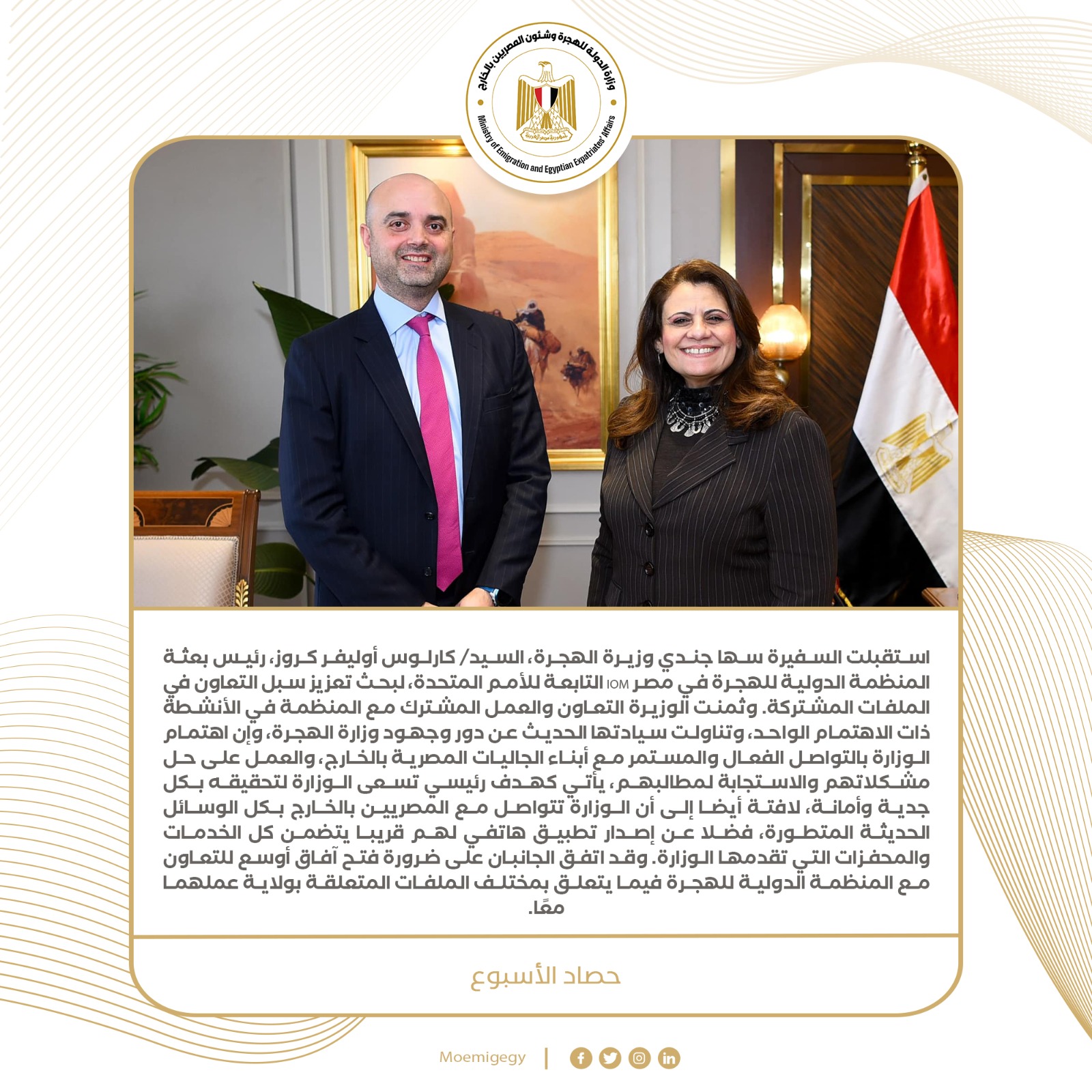 9- استقبلت السفيرة سها جندي وزيرة الهجرة، كارلوس أوليفر كروز، رئيس بعثة المنظمة الدولية للهجرة في مصر IOM التابعة للأمم المتحدة، لبحث تعزيز سبل التعاون في الملفات المشتركة.