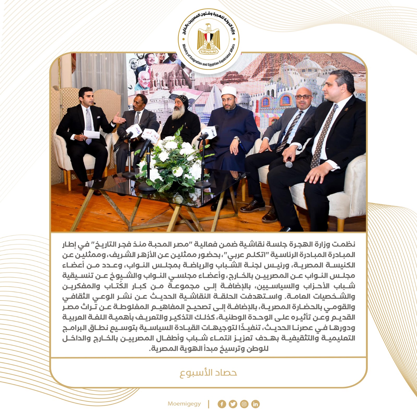 7- نظمت وزارة الهجرة جلسة نقاشية ضمن فعالية "مصر المحبة منذ فجر التاريخ" في إطار المبادرة المبادرة الرئاسية "اتكلم عربي"، بحضور ممثلين عن الأزهر الشريف، وممثلين عن الكنيسة المصرية، ورئيس لجنة الشباب والرياضة بمجلس النواب، وعدد من أعضاء مجلس النواب عن المصريين بالخارج، وأعضاء مجلسي النواب والشيوخ عن تنسيقية شباب الأحزاب والسياسيين، بالإضافة إلى مجموعة من كبار الكُتاب والمفكرين والشخصيات العامة.