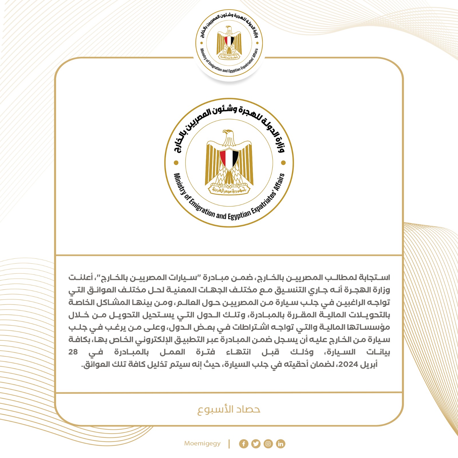 5- استجابة لمطالب المصريين بالخارج، ضمن مبادرة "سيارات المصريين بالخارج"، أعلنت وزارة الهجرة أنه جاري التنسيق مع مختلف الجهات المعنية لحل مختلف العوائق التي تواجه الراغبين في جلب سيارة من المصريين حول العالم، ومن بينها المشاكل الخاصة بالتحويلات المالية المقررة بالمبادرة، وتلك الدول التي يستحيل التحويل من خلال مؤسساتها المالية والتي تواجه اشتراطات في بعض الدول، وعلى من يرغب في جلب سيارة من الخارج عليه أن يسجل ضمن المبادرة عبر التطبيق الإلكتروني الخاص بها، بكافة بيانات السيارة، وذلك قبل انتهاء فترة العمل بالمبادرة في 28 أبريل 2024، لضمان أحقيته في جلب السيارة، حيث إنه سيتم تذليل كافة تلك العوائق.