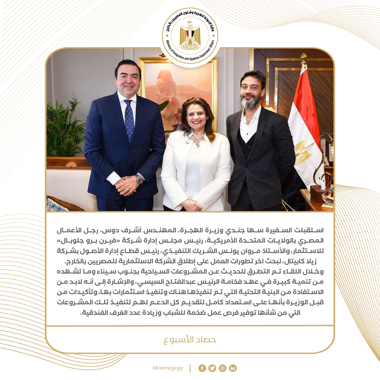 4- استقبلت السفيرة سها جندي وزيرة الهجرة، المهندس أشرف دوس، رجل الأعمال المصري بالولايات المتحدة الأمريكية، رئيس مجلس إدارة شركة «فيرن برو جلوبال» للاستثمار، والأستاذ مروان يونس الشريك التنفيذي، رئيس قطاع إدارة الأصول بشركة زيلا كابيتال، لبحث اخر تطورات العمل على إطلاق الشركة الاستثمارية للمصريين بالخارج.