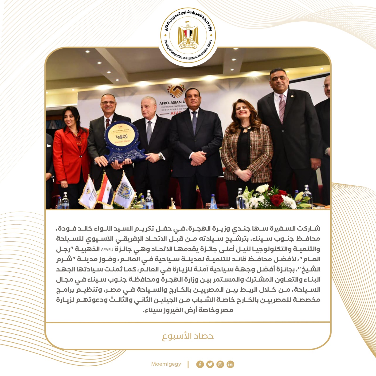 2- شاركت السفيرة سها جندي وزيرة الهجرة، في حفل تكريم اللواء خالد فودة، محافظ جنوب سيناء، بترشيح سيادته من قبل الاتحاد الإفريقي الآسيوي للسياحة والتنمية والتكنولوجيا لنيل أعلى جائزة يقدمها الاتحاد وهي جائزة AFASU الذهبية "رجل العام"، لأفضل محافظ قائد للتنمية لمدينة سياحية في العالم، وفوز مدينة "شرم الشيخ"، بجائزة أفضل وجهة سياحية آمنة للزيارة في العالم، كما ثمنت سيادتها الجهد البناء والتعاون المشترك والمستمر بين وزارة الهجرة ومحافظة جنوب سيناء في مجال السياحة، من خلال الربط بين المصريين بالخارج والسياحة في مصر، وتنظيم برامج مخصصة للمصريين بالخارج خاصة الشباب من الجيلين الثاني والثالث ودعوتهم لزيارة مصر وخاصة أرض الفيروز سيناء.