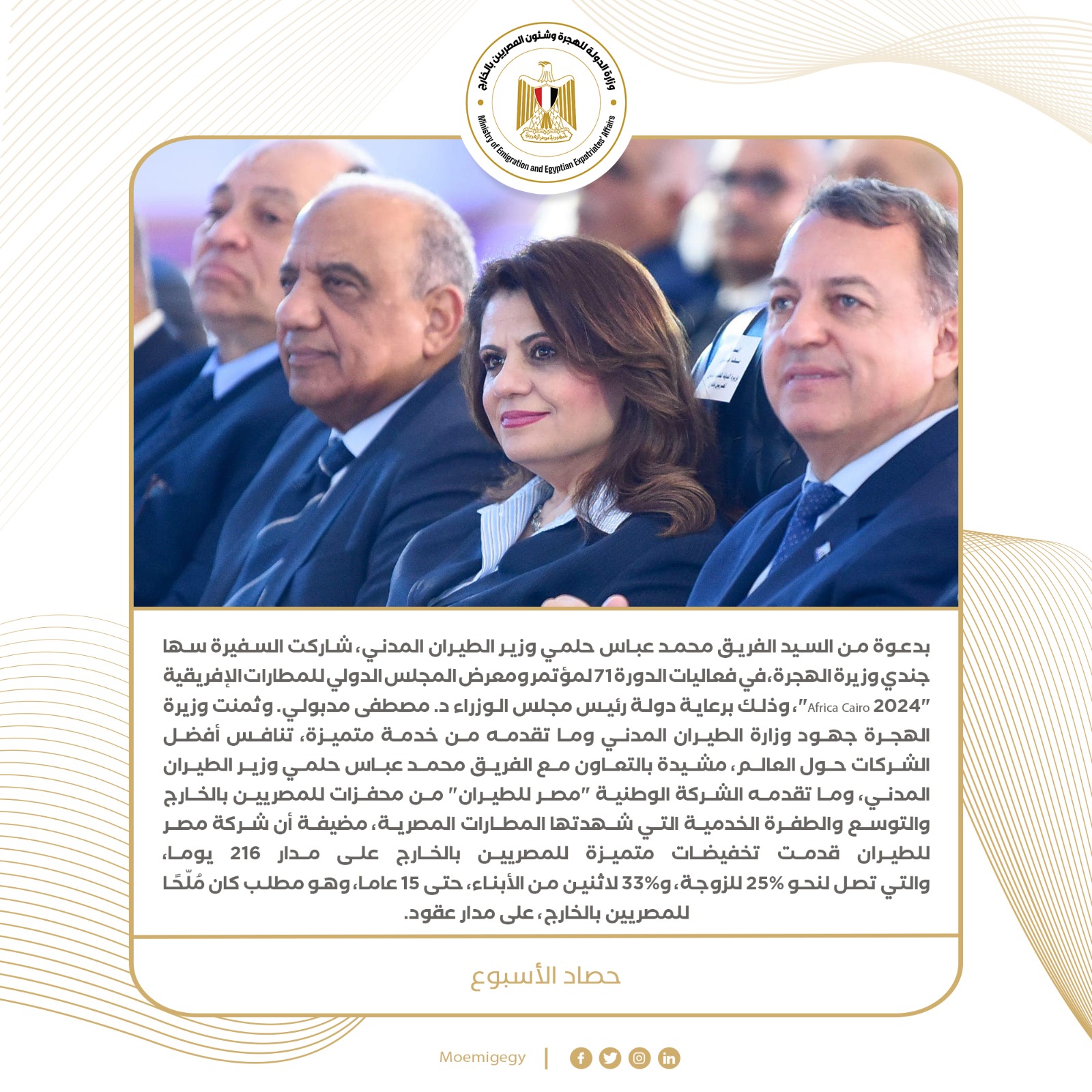 3- بدعوة من الفريق محمد عباس حلمي وزير الطيران المدني، شاركت السفيرة سها جندي وزيرة الهجرة، في فعاليات الدورة 71 لمؤتمر ومعرض المجلس الدولي للمطارات الإفريقية "Africa Cairo 2024"، وذلك برعاية دولة رئيس مجلس الوزراء د. مصطفى مدبولي. وثمنت وزيرة الهجرة جهود وزارة الطيران المدني وما تقدمه من خدمة متميزة، تنافس أفضل الشركات حول العالم، مشيدة بالتعاون مع الفريق محمد عباس حلمي وزير الطيران المدني، وما تقدمه الشركة الوطنية "مصر للطيران" من محفزات للمصريين بالخارج والتوسع والطفرة الخدمية التي شهدتها المطارات المصرية، مضيفة أن شركة مصر للطيران قدمت تخفيضات متميزة للمصريين بالخارج على مدار 216 يوما، والتي تصل لنحو 25% للزوجة، و33% لاثنين من الأبناء، حتى 15 عاما، وهو مطلب كان مُلّحًا للمصريين بالخارج، على مدار عقود.