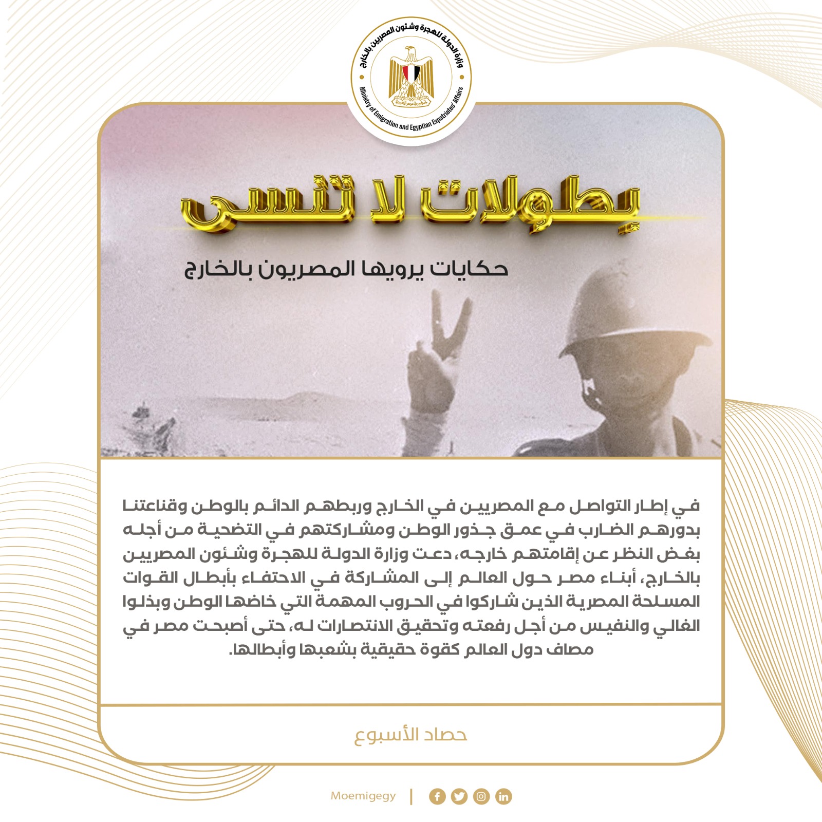 1- في إطار التواصل مع المصريين في الخارج وربطهم الدائم بالوطن وقناعتنا بدورهم الضارب في عمق جذور الوطن ومشاركتهم في التضحية من أجله بغض النظر عن إقامتهم خارجه، دعت وزارة الدولة للهجرة وشئون المصريين بالخارج، أبناء مصر حول العالم إلى المشاركة في الاحتفاء بأبطال القوات المسلحة المصرية الذين شاركوا في الحروب المهمة التي خاضها الوطن وبذلوا الغالي والنفيس من أجل رفعته وتحقيق الانتصارات له، حتى أصبحت مصر في مصاف دول العالم كقوة حقيقية بشعبها وأبطالها.