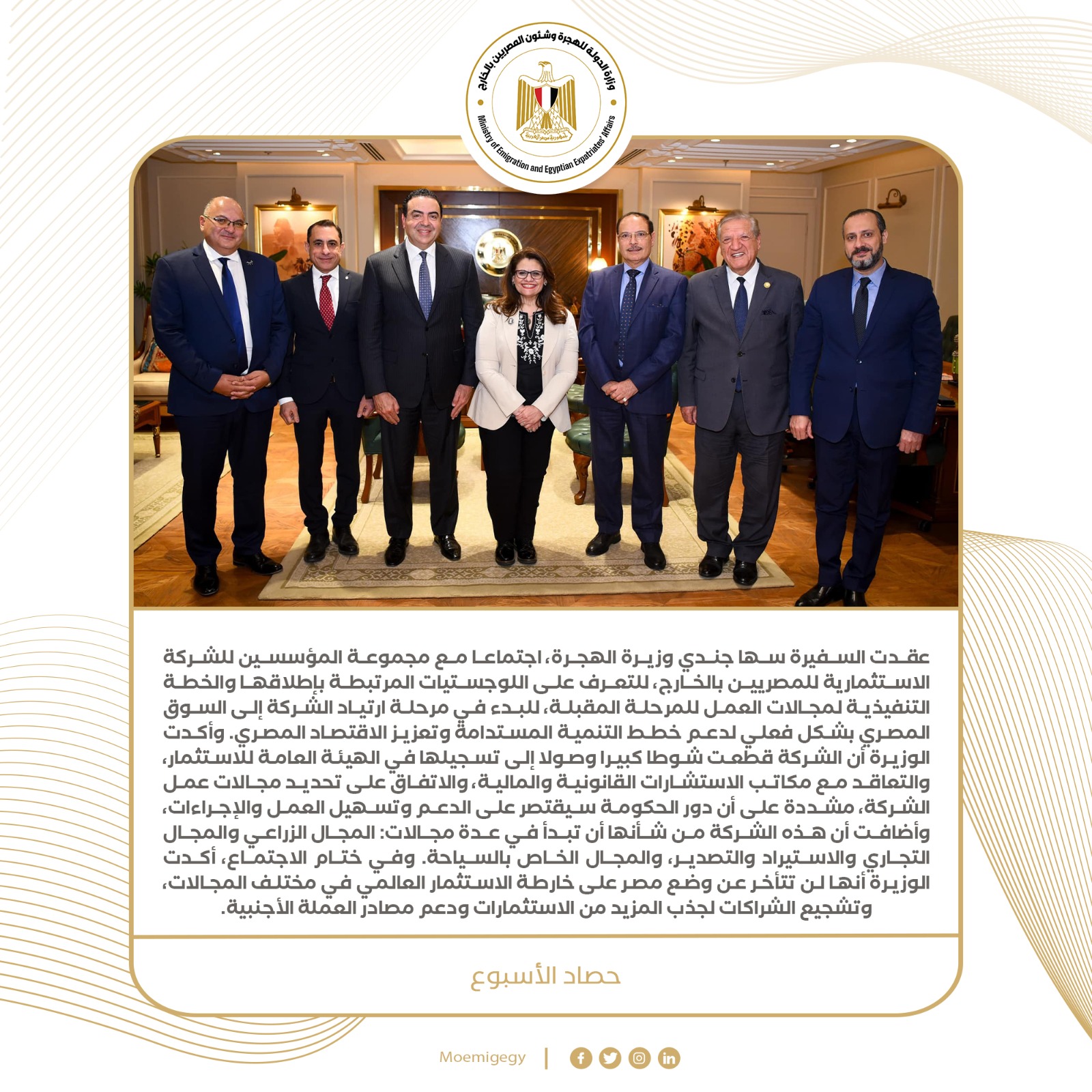 10- عقدت السفيرة سها جندي وزيرة الهجرة، اجتماعا مع مجموعة المؤسسين للشركة الاستثمارية للمصريين بالخارج، للتعرف على اللوجستيات المرتبطة بإطلاقها والخطة التنفيذية لمجالات العمل للمرحلة المقبلة، للبدء في مرحلة ارتياد الشركة إلى السوق المصري بشكل فعلي لدعم خطط التنمية المستدامة وتعزيز الاقتصاد المصري.