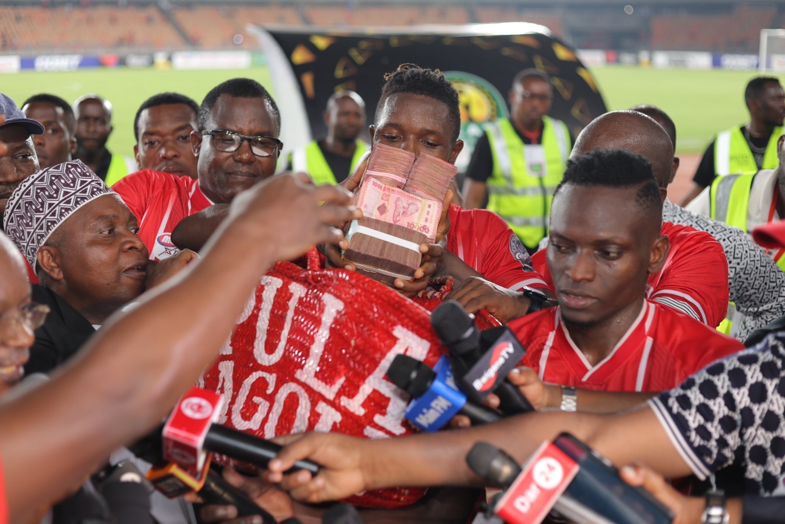كاش، رئيس سيمبا التنزاني يوزع مكافآت التأهل لربع نهائي دوري الأبطال داخل الملعب