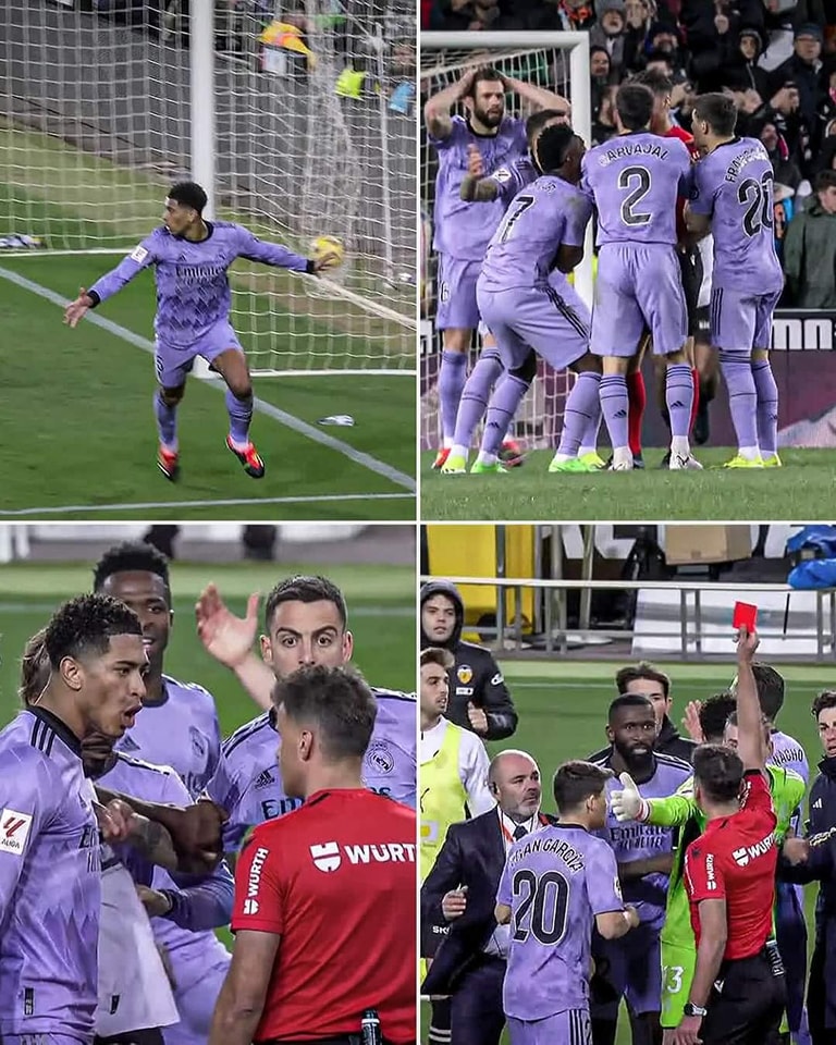 ونال الإنجليزي جود بيلينجهام نجم ريال مدريد، بطاقة حمراء، بعد نهاية مباراة فريقه أمام فالنسيا بالتعادل 2-2 على ملعب ميستايا، ضمن منافسات الجولة 27 بالليجا.
