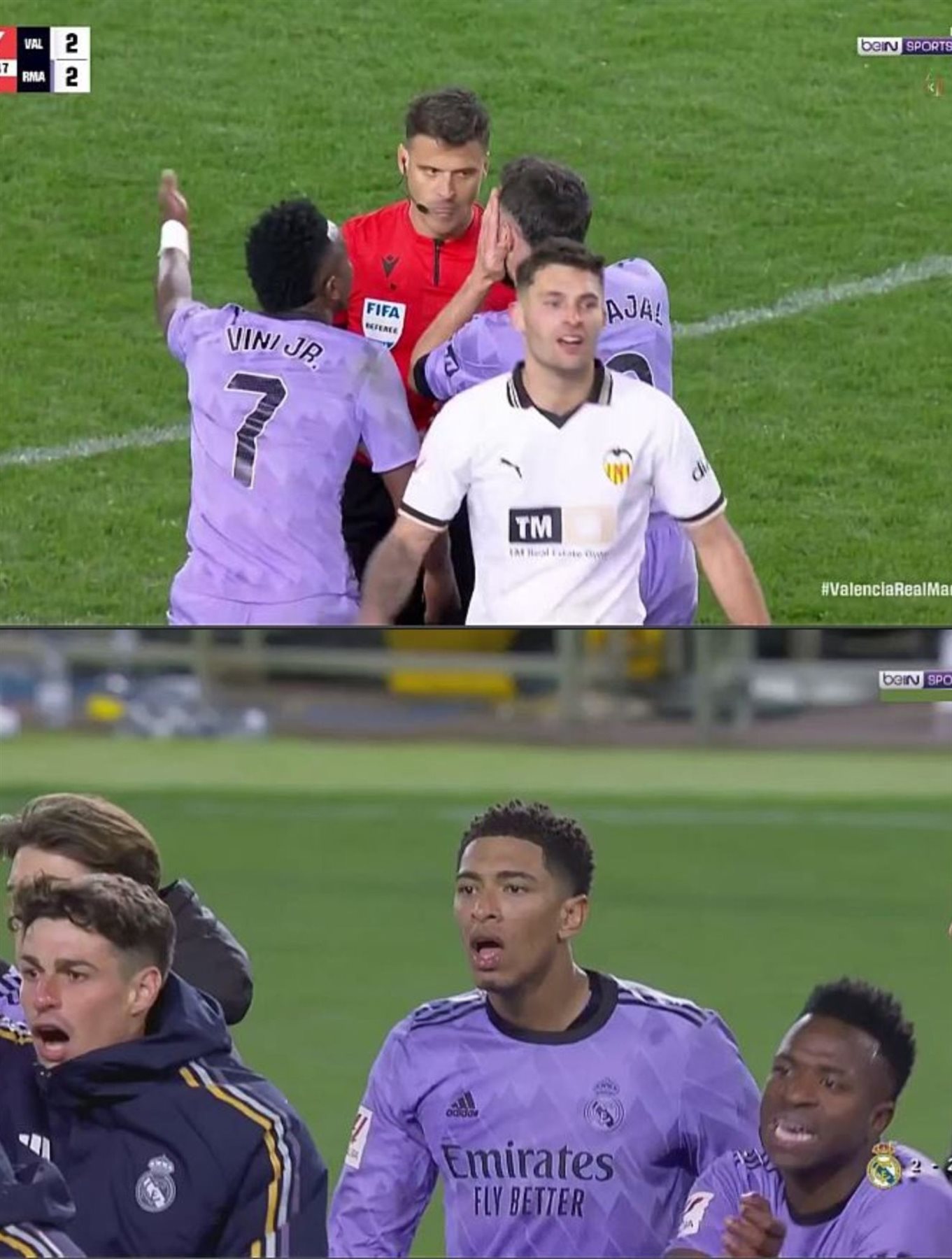سخر البرازيلي فينيسيوس جونيور نجم ريال مدريد، من خيسوس خيل مانزانو حكم مباراة فالنسيا، التي انتهت بالتعادل الإيجابي (2-2)، مساء السبت، ضمن منافسات الجولة 27 من الليجا، في معقل الخفافيش ملعب "ميستايا".