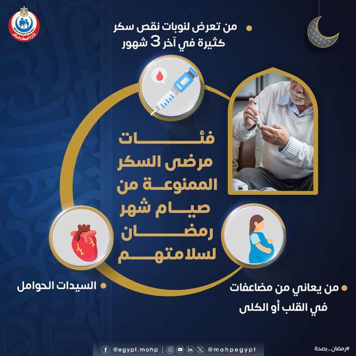 وكشفت وزارة الصحة عن وجود عدد من الفئات من مرضى السكر ممنوعين من الصيام منهم: