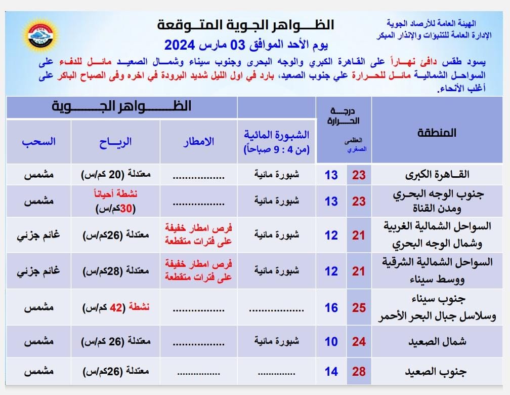وحذرت هيئة الأرصاد الجوية من شبورة مائية على الطرق السريعة والقريبة من المسطحات المائية على القاهرة الكبرى والسواحل الشمالية ومدن القناة ووسط سيناء ومدن القناة.