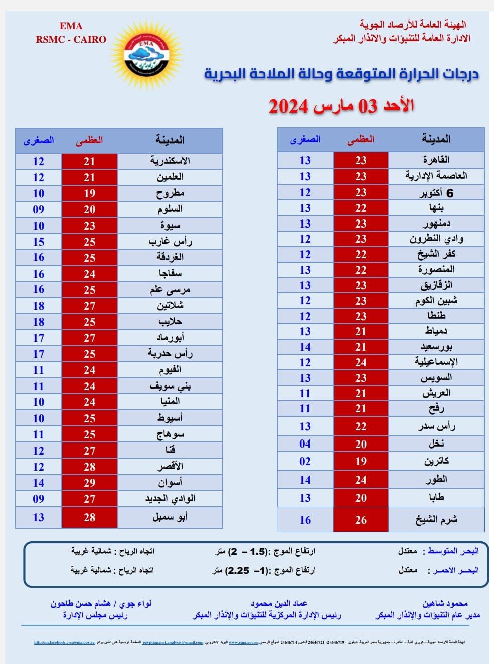 وتوقعت هيئة الأرصاد الجوية أن يسود طقس بارد في أول الليل شديد البرودة في آخره وفي الصباح الباكرعلى شمال البلاد والقاهرة الكبرى والوجه البحري، وشمال الصعيد.