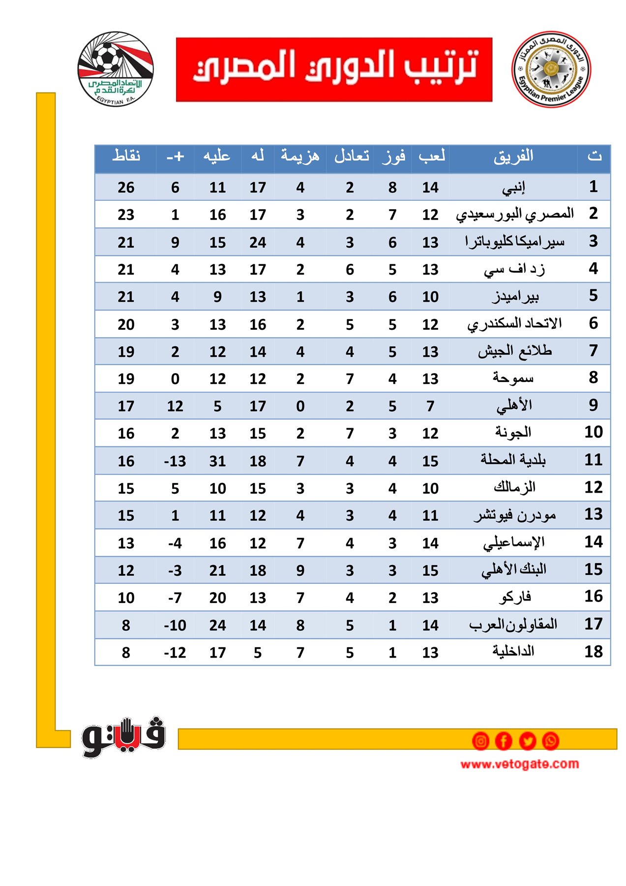 ترتيب الدوري المصري قبل مباراة إنبي والاتحاد السكندري