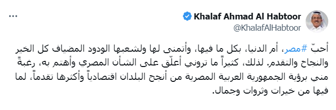 وقال رجل الأعمال خلف الحبتور عن تعلقه بالشأن المصري: "أحبّ #مصر، أم الدنيا، بكل ما فيها، وأتمنى لها ولشعبها الودود المضياف كل الخير والنجاح والتقدم."