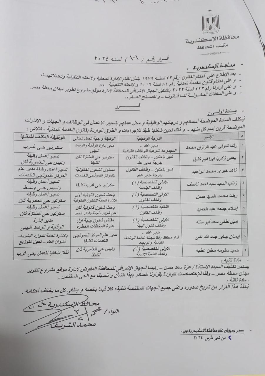 وحمل القرار تكليف رشا شوقى عبدالرازق، بالعمل فى وظيفة سكرتير حى غرب الاسكندرية ندبا من عملها كرئيس ادارة شئون البيئة، ويحيى زكريا ابراهيم، للعمل فى وظيفة رئيس حى العامرية ثان ندبا من عمله سكرتير عا حي المنتزة ثان، وناهد خيرى محمد، للعمل فى وظيفة مدير عام المركز النموذجى للخدمات، وزينب السيد ناصف، للعمل فى وظيفة رئيس حى وسط.