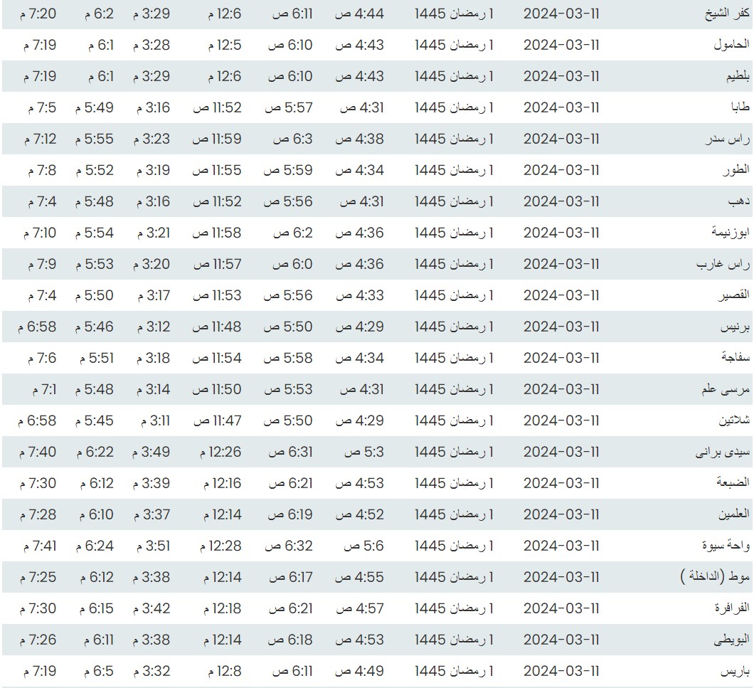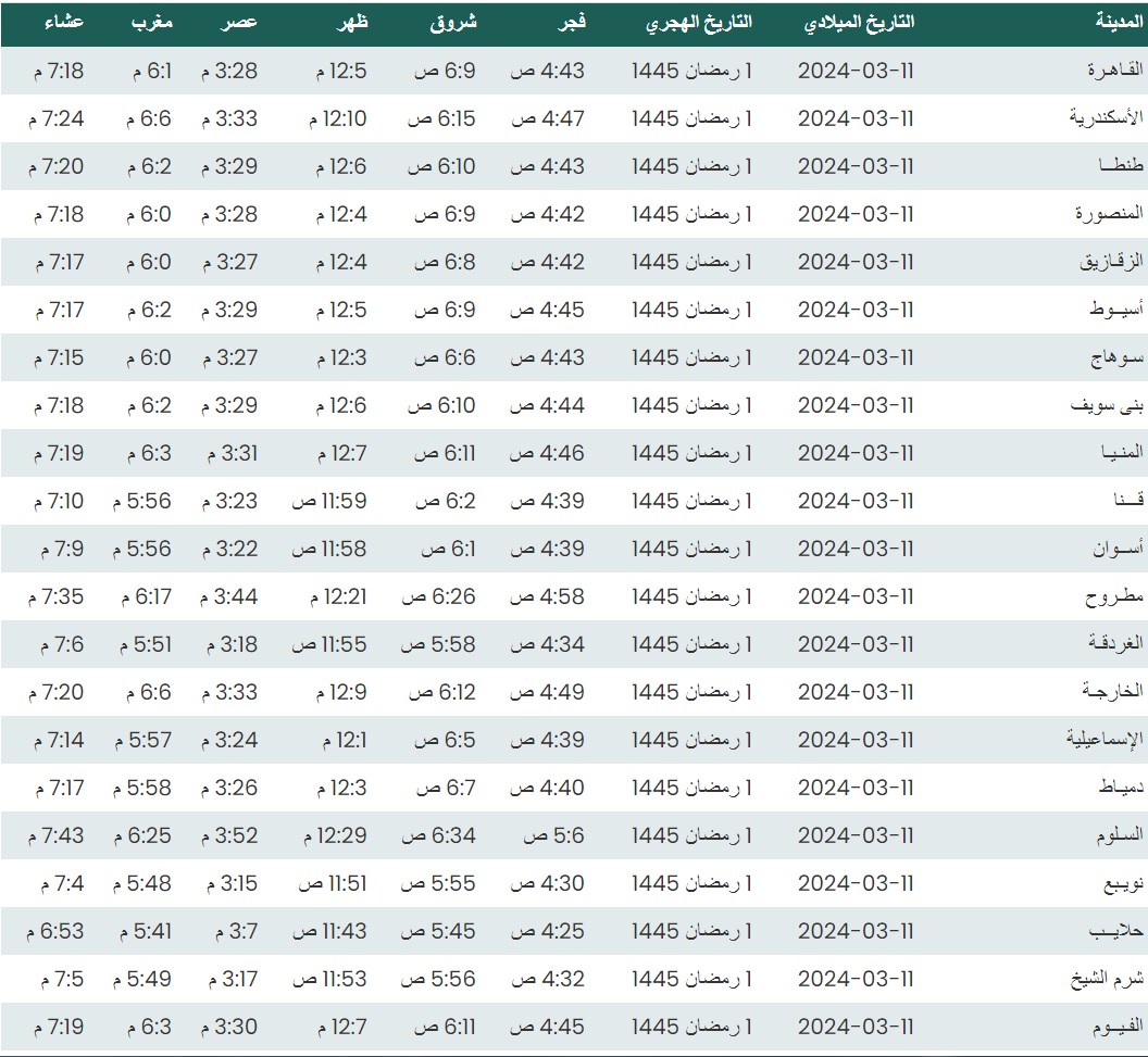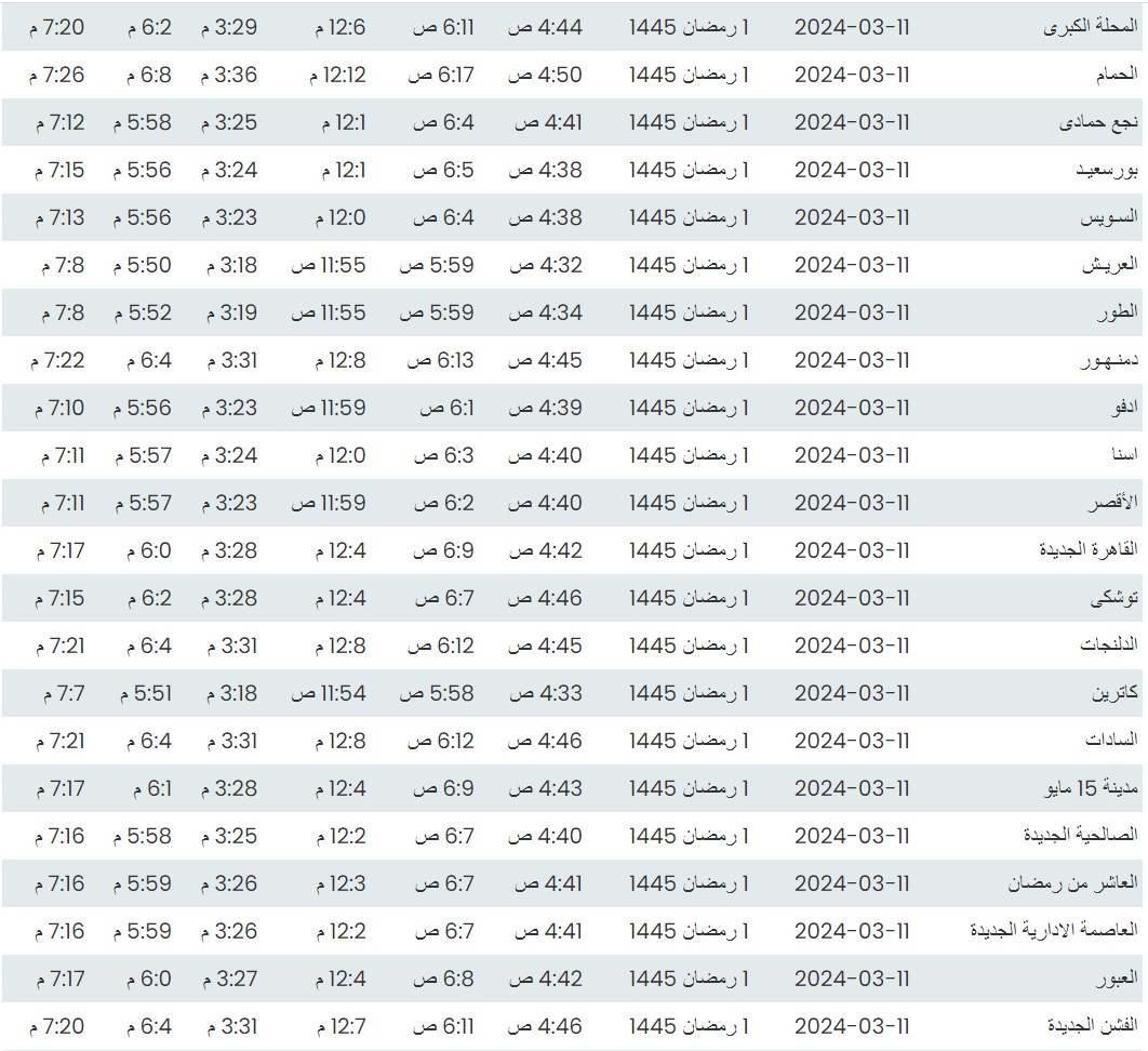 وفيما يلي مواقيت الصلاة، لعدد من مدن ومحافظات الجمهورية من واقع بيانات الهيئة العامة للمساحة