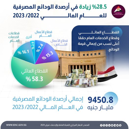 معلومات الوزراء: 28.5 % زيادة في أرصدة الودائع المصرفية للعام المالي 2022-2023 (إنفوجراف)