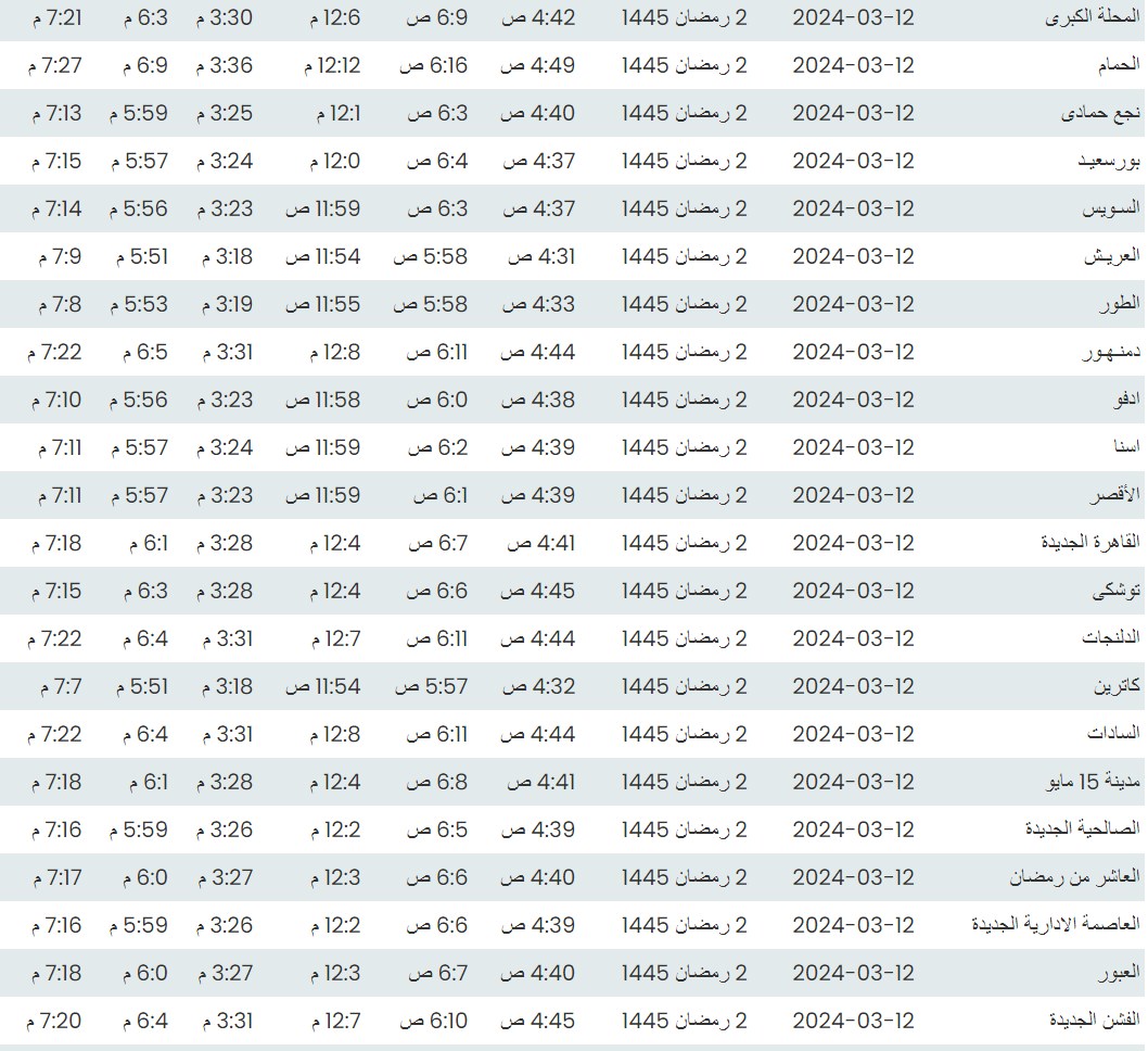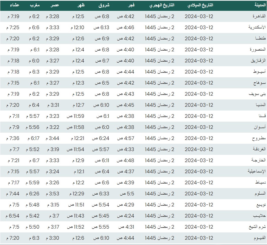 وفيما يلي مواقيت الصلاة، لعدد من مدن ومحافظات الجمهورية من واقع بيانات الهيئة العامة للمساحة