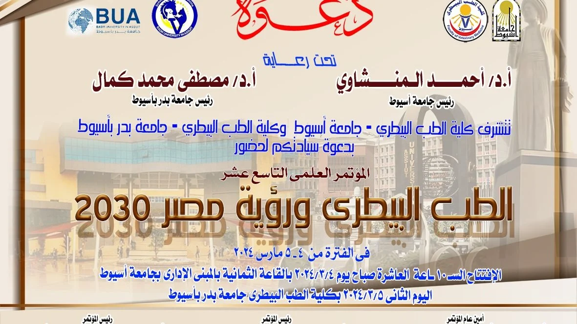 تشهد جامعة أسيوط، غدًا الإثنين ٤ مارس، انطلاق فعاليات المؤتمر العلمي التاسع عشر حول "الطب البيطري ورؤية مصر ٢٠٣٠"، والذي تنظمه كلية الطب البيطري بالجامعة، بالتعاون مع كلية الطب البيطري، بجامعة بدر بأسيوط، وذلك في تمام الساعة العاشرة صباحًا، بالقاعة الثمانية بالمبنى الإداري بالجامعة، تحت رعاية الدكتور أحمد المنشاوي رئيس الجامعة، والدكتور مصطفى محمد كمال رئيس جامعة بدر بأسيوط، وإشراف الدكتورة مديحة درويش عميد كلية الطب البيطري، ورئيس المؤتمر، والدكتور ساري خليل عبد الغفار عميد كلية الطب البيطري جامعة بدر بأسيوط، ورئيس المؤتمر.