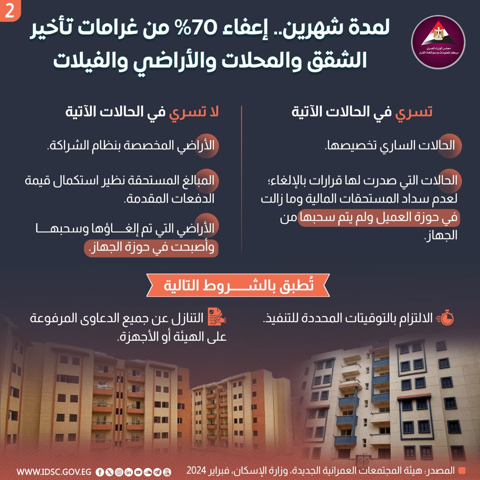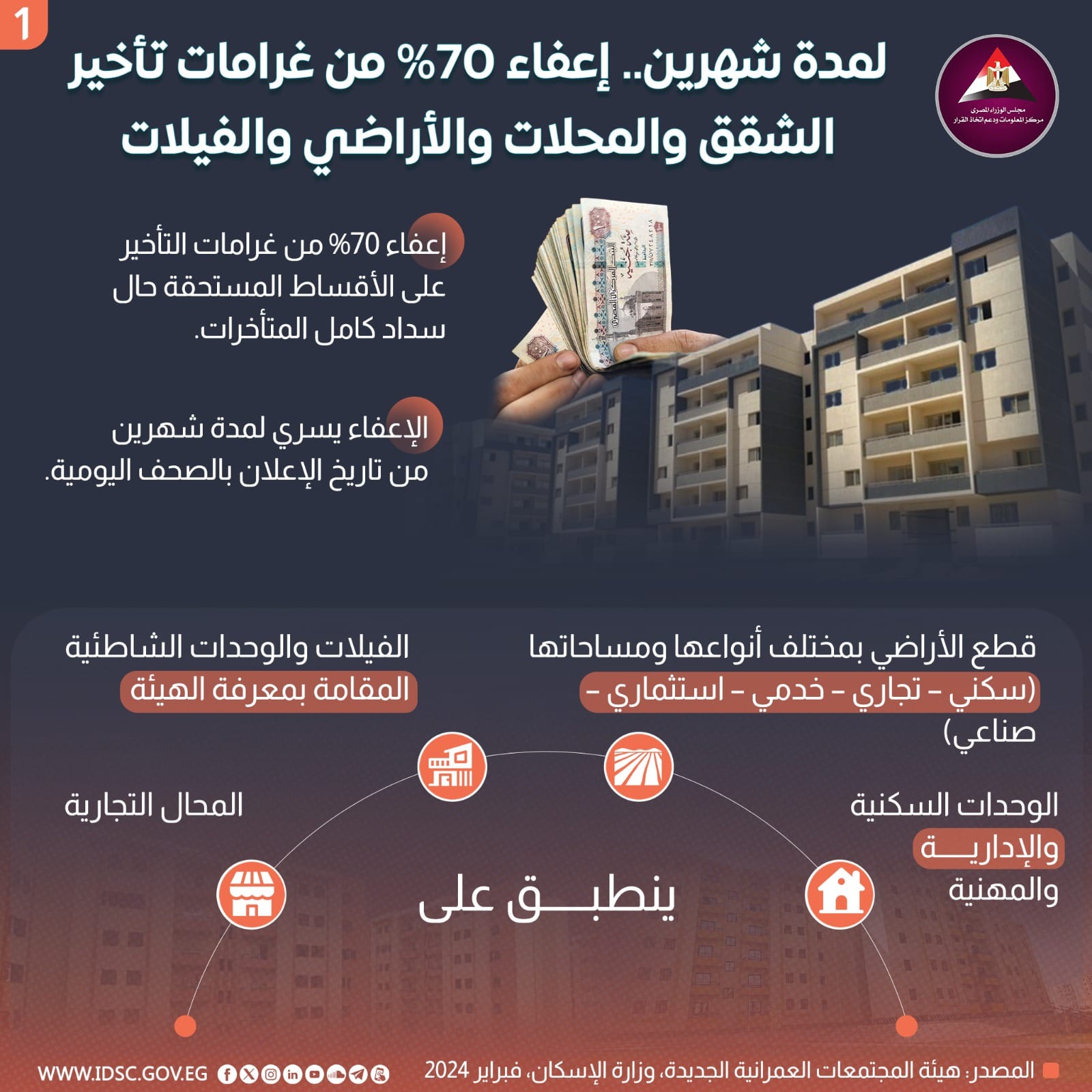 نشرت الصفحة الرسمية لمركز المعلومات ودعم اتخاذ القرار بمجلس الوزراء على موقع التواصل الاجتماعي "فيسبوك" إنفوجراف جديدا تحت عنوان (لمدة شهرين..إعفاء 70% من غرامات تأخير الشقق والمحلات والأراضي والفيلات )