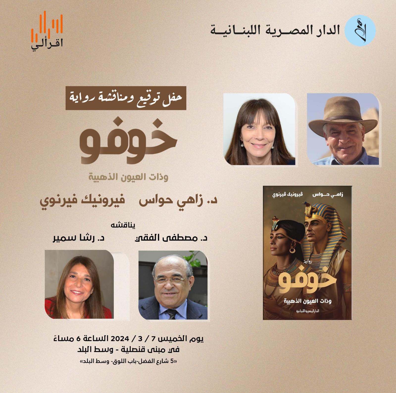 تنظم الدار المصرية اللبنانية للنشر والتوزيع، حفل توقيع ومناقشة رواية "خوفو وذات العيون الذهبية" للدكتور زاهي حواس والكاتبة الفرنسية فيرونيك فيرنوي، وذلك في تمام السادسة من مساء يوم الخميس المقبل، بمبنى قنصلية بوسط القاهرة.