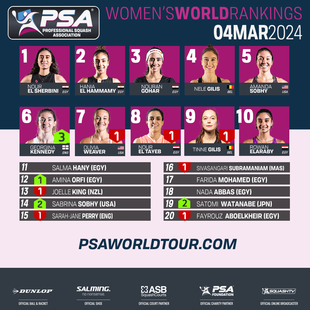 تصنيف الإسكواش، 10 مصريات في قائمة الأفضل ونور الشربيني تتصدر
