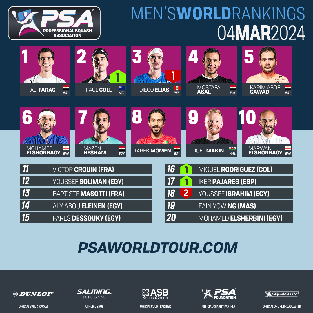 تصنيف الإسكواش، 10 مصريين في قائمة الأفضل وعلي فرج يتصدر