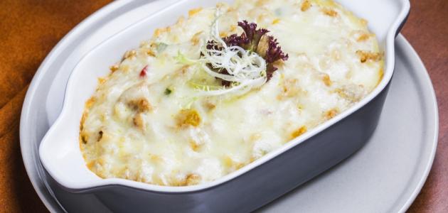 - ثم نضع على الوجه باقى كمية البشاميل المتبقى والجبن المبشور.