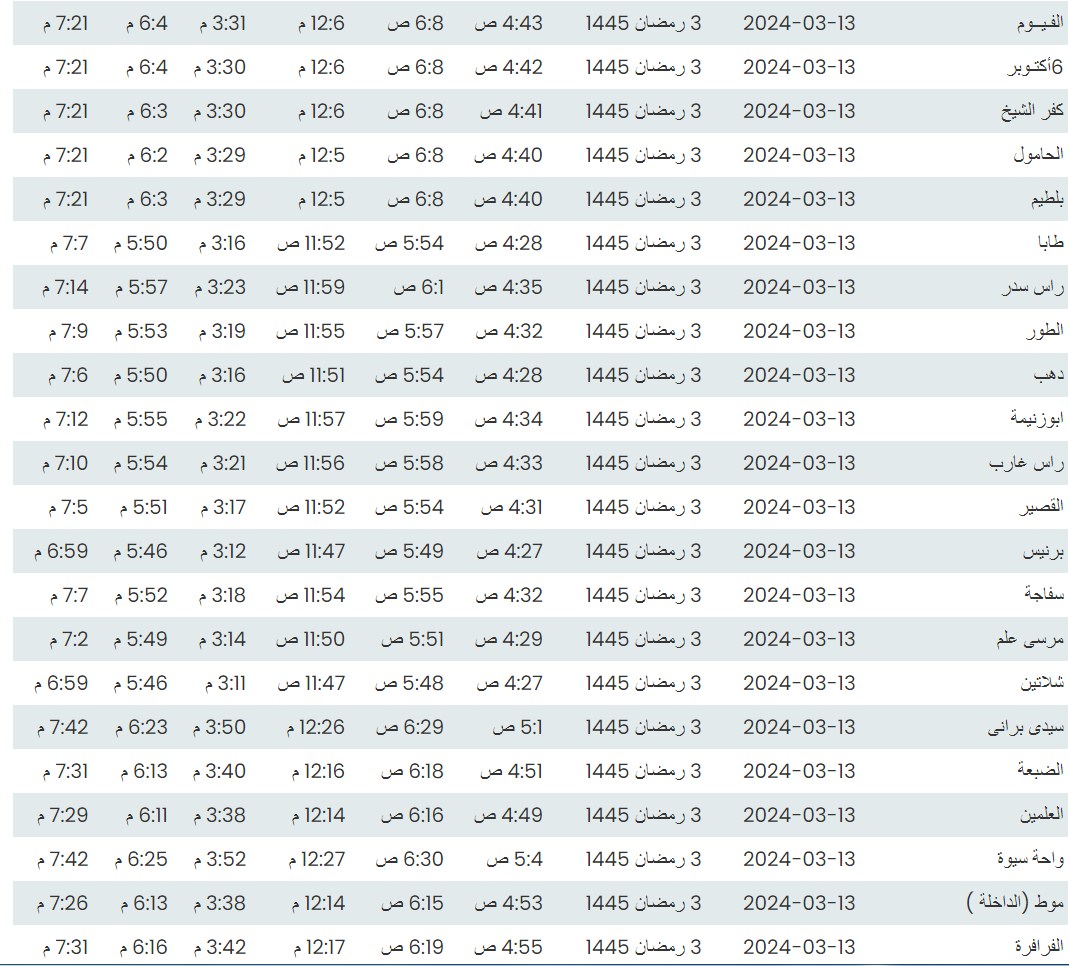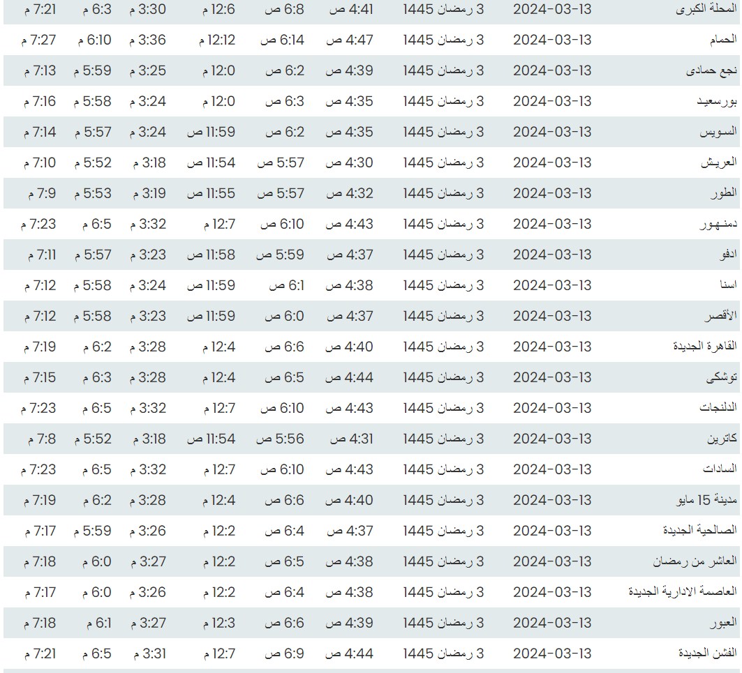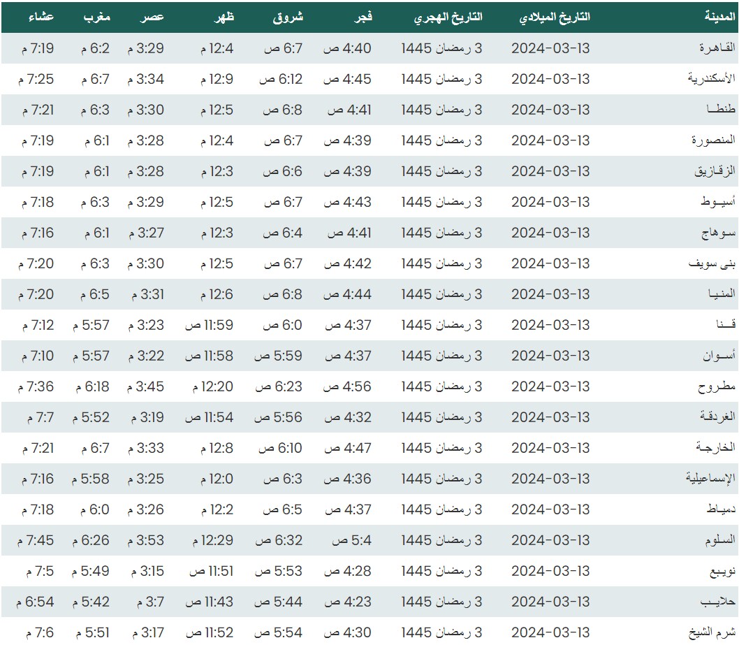 وفيما يلي مواقيت الصلاة، لعدد من مدن ومحافظات الجمهورية من واقع بيانات الهيئة العامة للمساحة