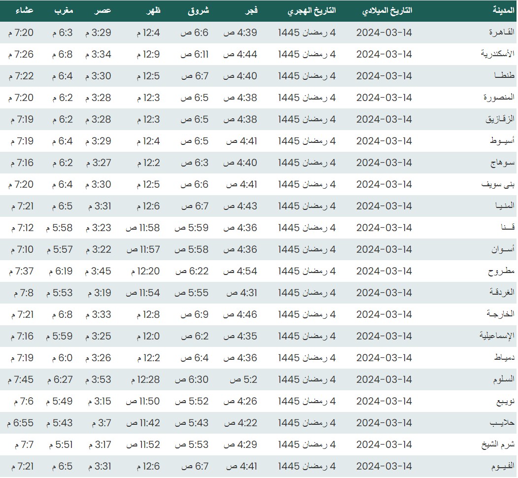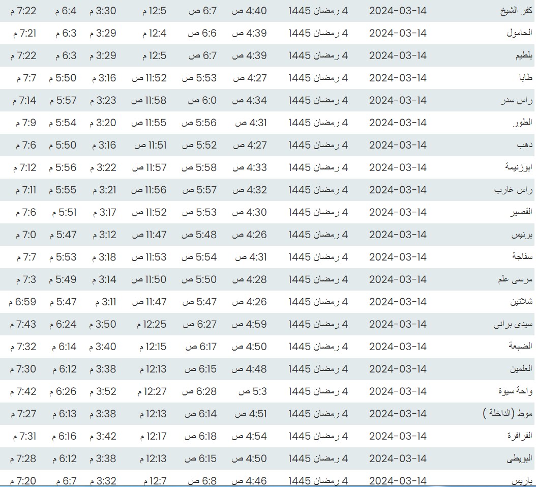 وفيما يلي مواقيت الصلاة، لعدد من مدن ومحافظات الجمهورية من واقع بيانات الهيئة العامة للمساحة
