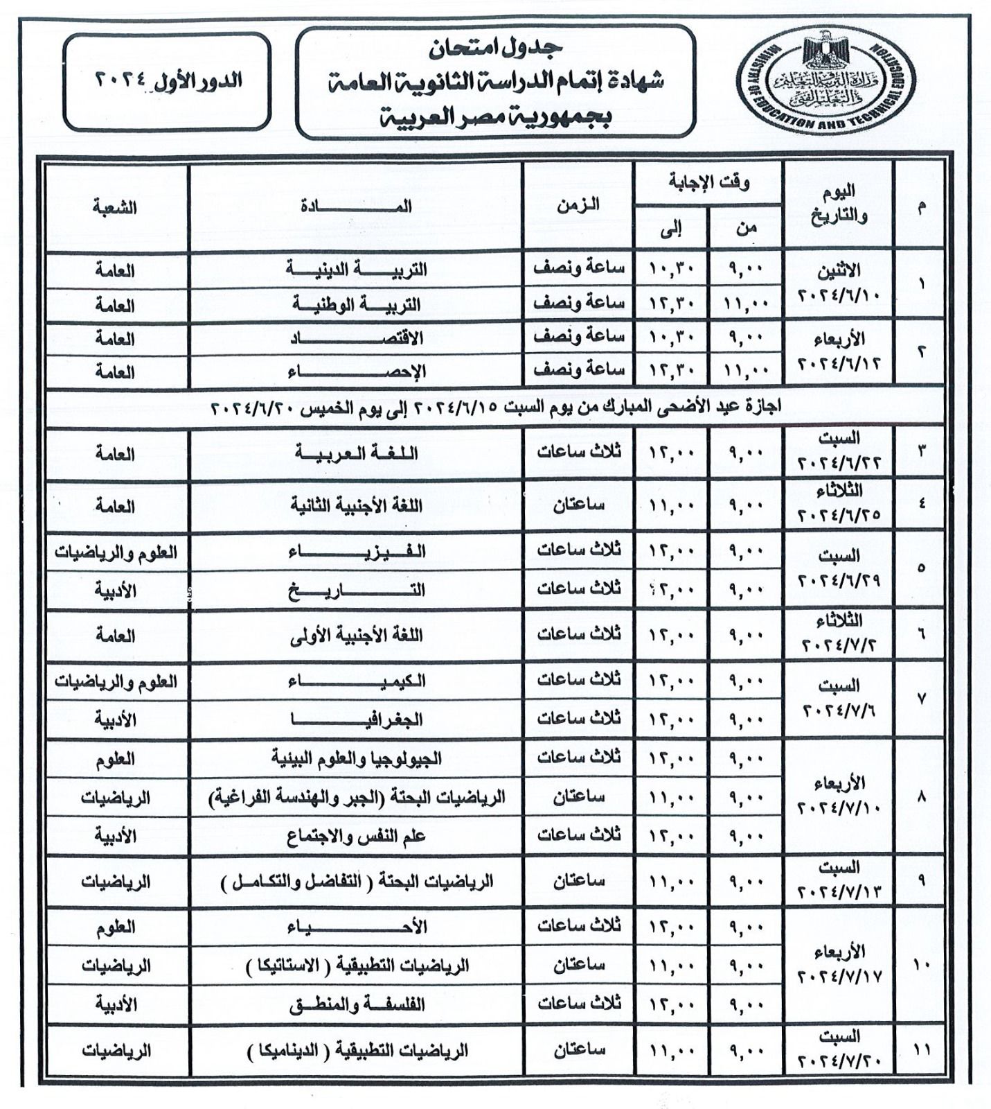 وأكد الوزير أن الجدول يراعي الفترات الزمنية بين الامتحانات في جميع الشعب المختلفة حتى يتاح للطلاب الفرصة المناسبة للمراجعة.