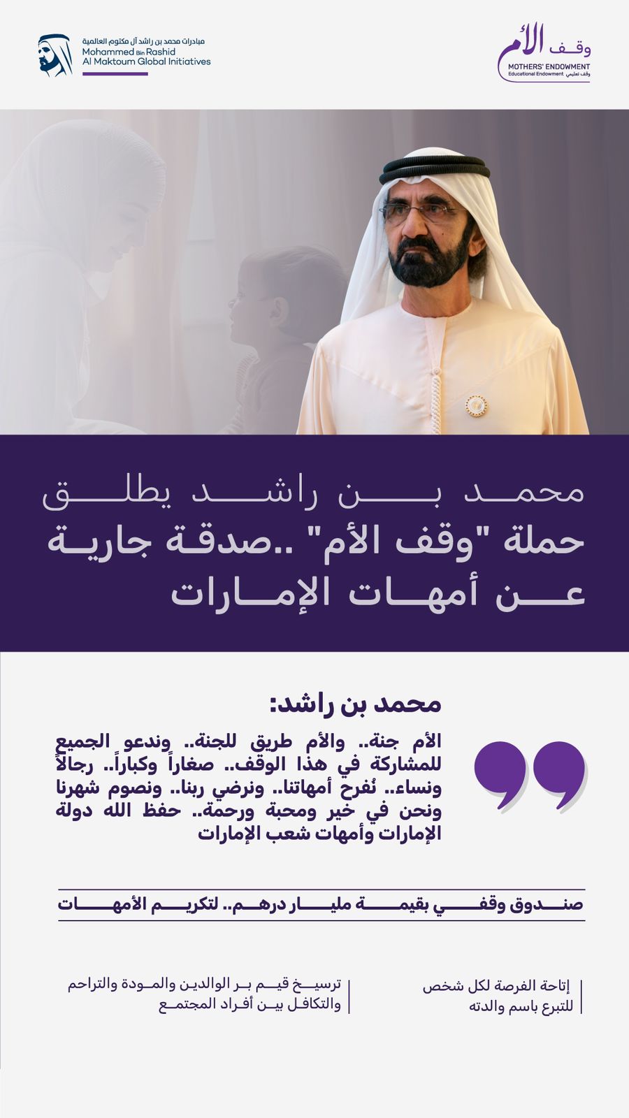 وأعلن صاحب السمو الشيخ محمد بن راشد آل مكتوم في تدوينة له على منصة "إكس" قائلًا: الأخوة والأخوات.. يحل علينا شهر كريم.. وجريًا على عادتنا السنوية في إطلاق حملة رمضانية إنسانية من شعب الإمارات.. نطلق اليوم "وقف الأم".. وقف تعليمي بقيمة مليار درهم صدقة جارية عن الأمهات في دولة الإمارات".
