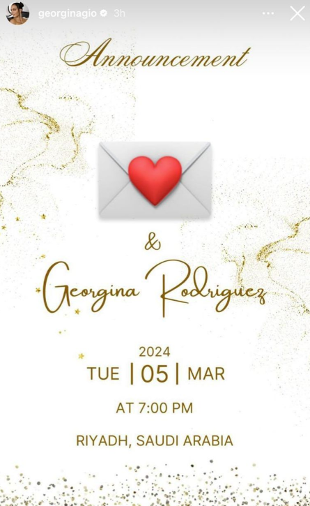ووضعت جورجينا صورة قلب على بطاقة دعوة وتحتها اسمها بالكامل مع كتابة تاريخ يوم الثلاثاء المقبل 5 مارس 2024، كما كتبت موعد الساعة السابعة مساء بالتوقيت المحلي، على أن يكون المكان في العاصمة السعودية الرياض.