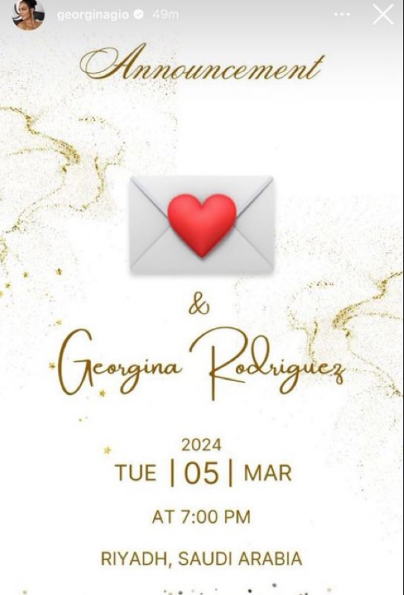حيث علق تامر علي قائلًا: "وضعت جورجينا صورة قلب على بطاقة دعوة وتحتها اسمها بالكامل مع كتابة تاريخ يوم الثلاثاء 5 آذار 2024، وموعد الساعة السابعة مساءً، المكان في العاصمة السعودية الرياض، لم تكشف جورجينا تفاصيل أخرى عن الحدث، لكن من المرجح أن يتم خلال هذا الحفل الإعلان رسميا عن زواجهما في انتظار صدور أي بيانات أخرى سواء من الدون أو شريكته."