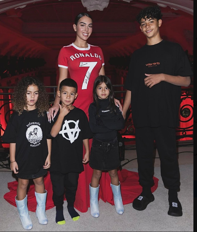 أنجبت جورجينا من رونالدو طفلة في عام 2017 ثم طفلة بيلا في عام 2021، والتي مات شقيقها التوأم عند ميلاده في واقعة مؤلمة في مشوار علاقة رونالدو وجورجينا. أما باقي أطفال رونالدو فهم من أم بديلة.