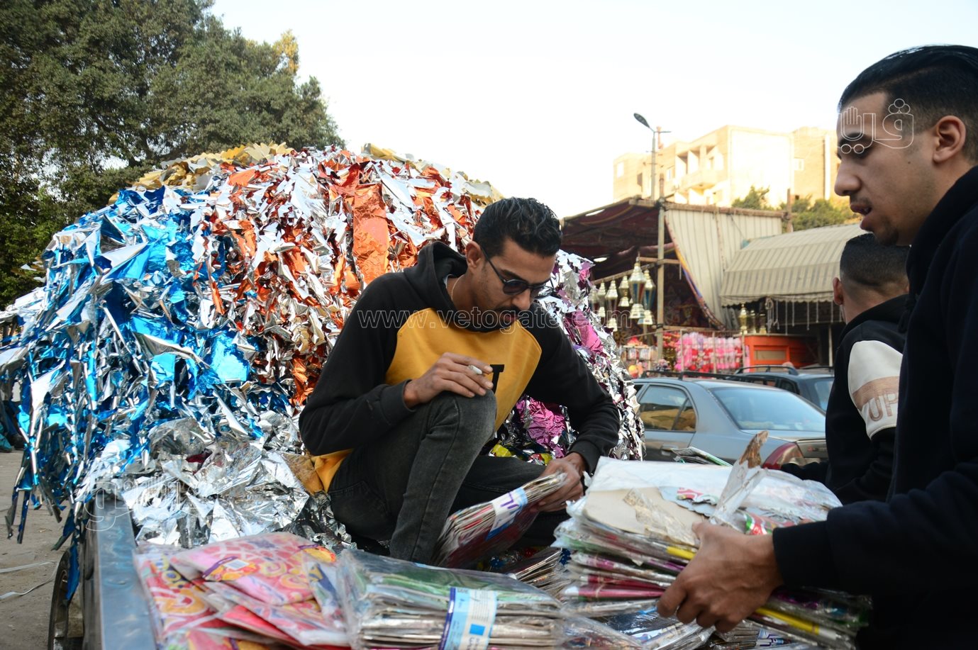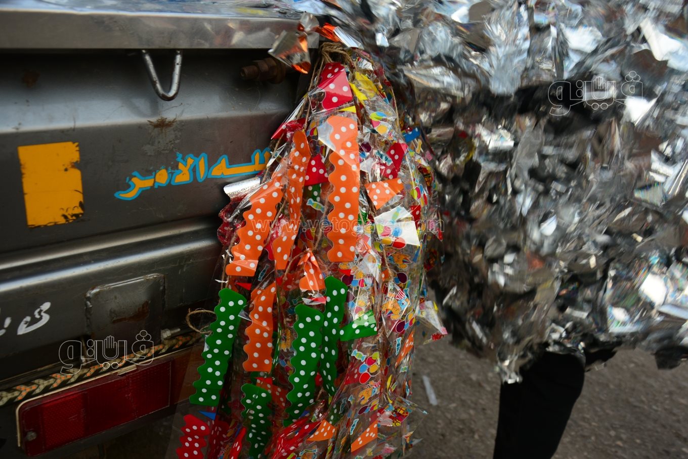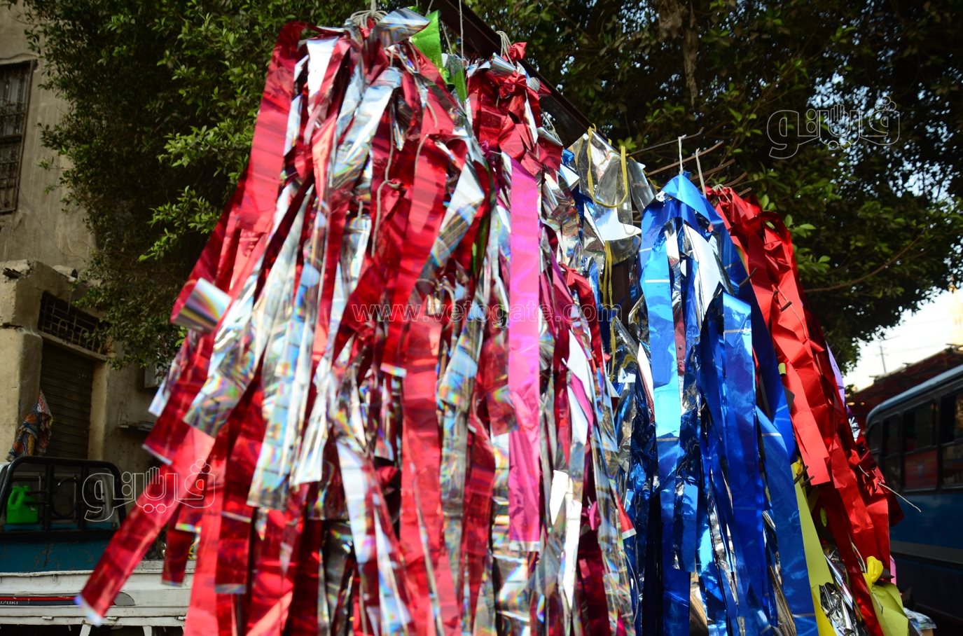 وبعد سيارة عثمان الربع نقل ببضعة مترات نجد استاند زينة آخر تباع فيه شراشيب متعددة الألوان وسعر المتر فيها 5 جنيهات.