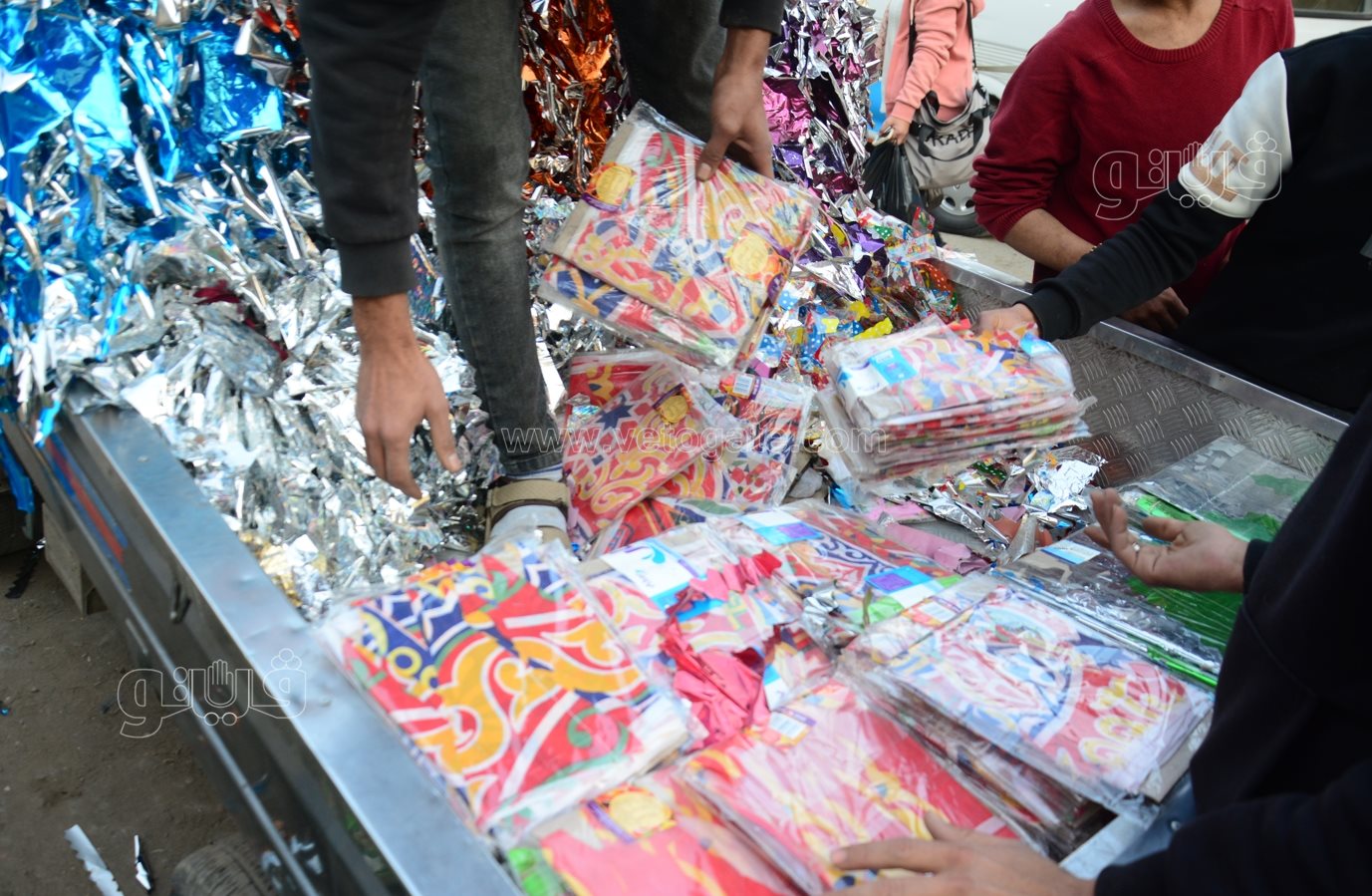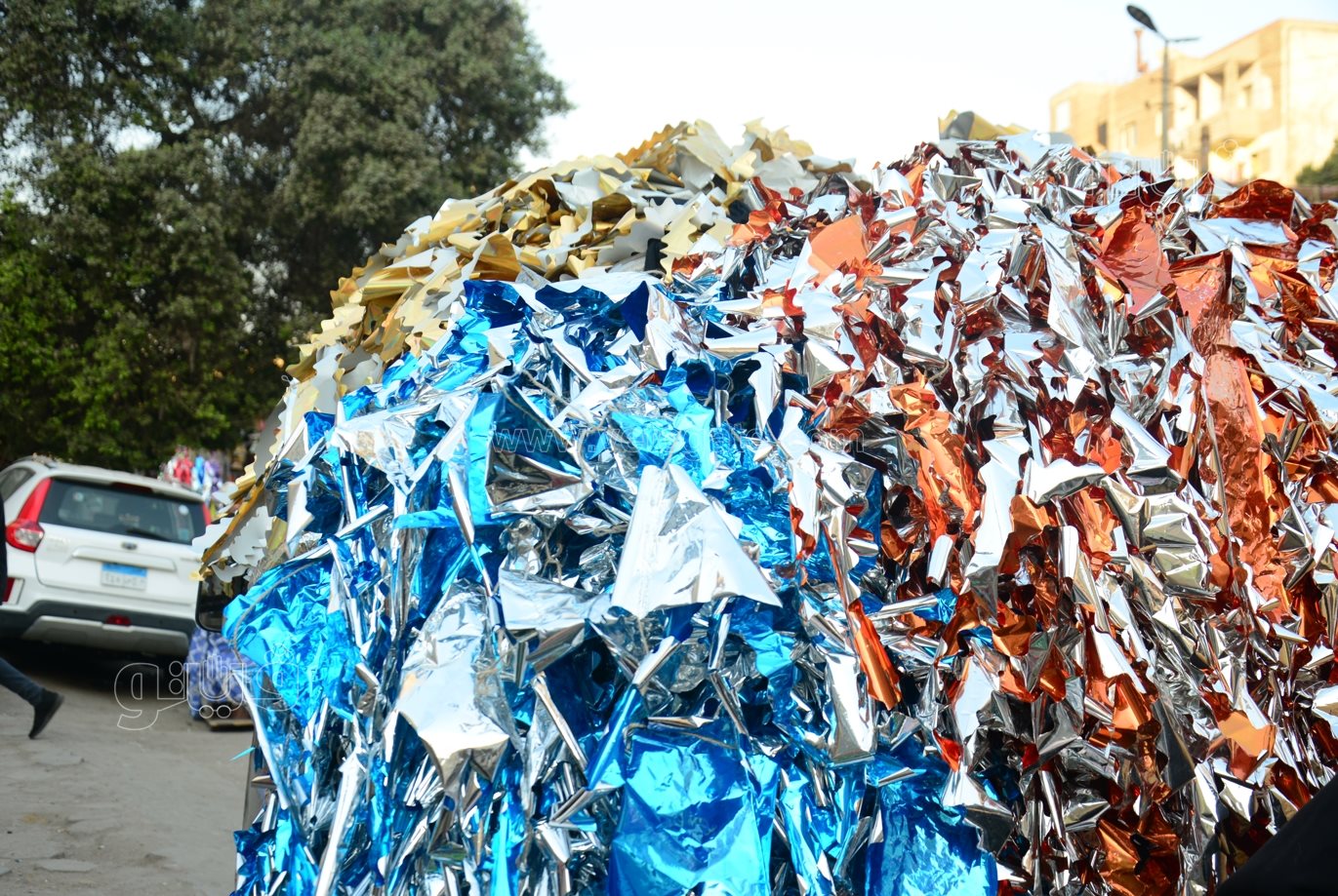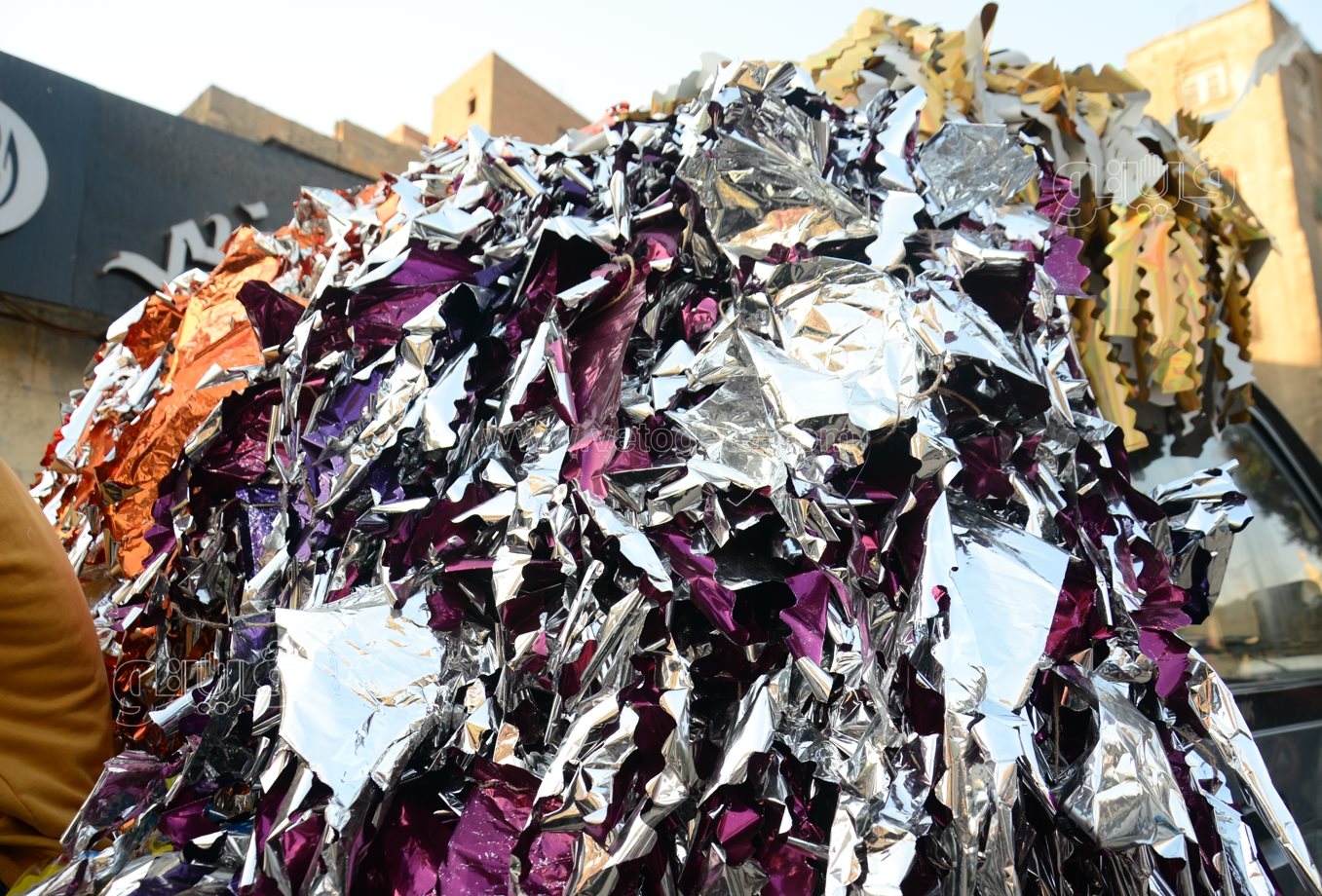 وبعد سيارة عثمان الربع نقل ببضعة مترات نجد استاند زينة آخر تباع فيه شراشيب متعددة الألوان وسعر المتر فيها 5 جنيهات.