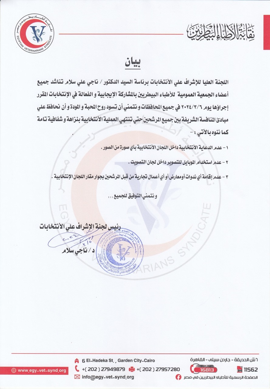 بيان عاجل من اللجنة العليا للإشراف على انتخابات التجديد النصفي لنقابة البيطريين