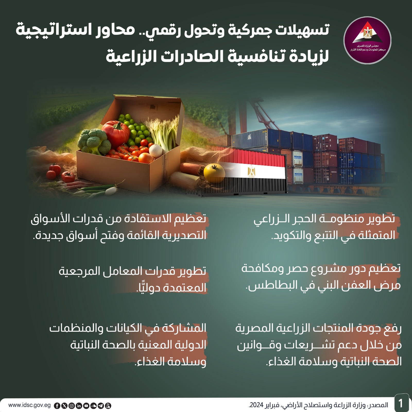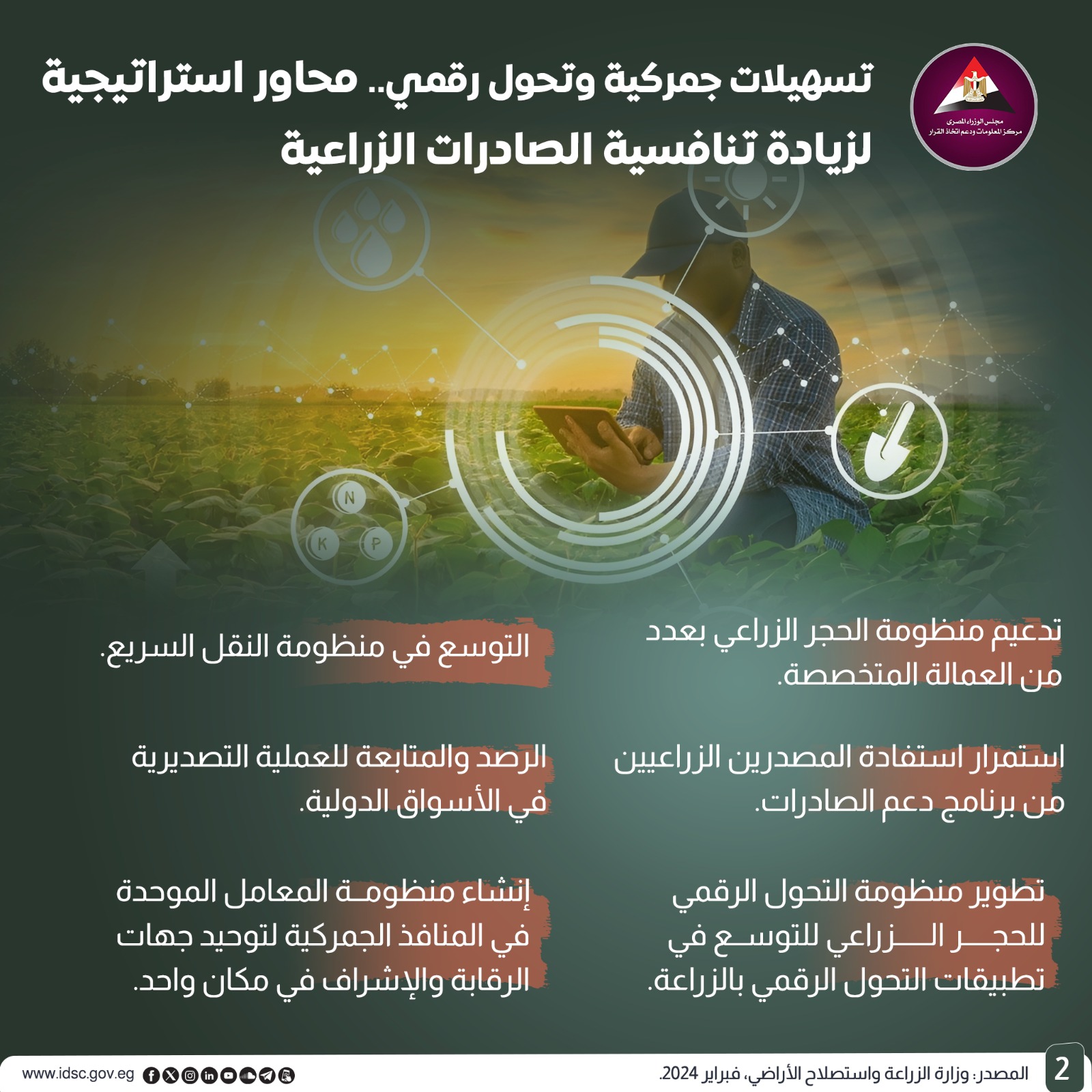 نشرت الصفحة الرسمية لمركز المعلومات ودعم اتخاذ القرار بمجلس الوزراء على موقع التواصل الاجتماعي "فيسبوك" إنفوجراف جديدا تحت عنوان (تسهيلات جمركية وتحول رقمي..محاور استراتيجية لزيادة تنافسية الصادرات الزراعية)