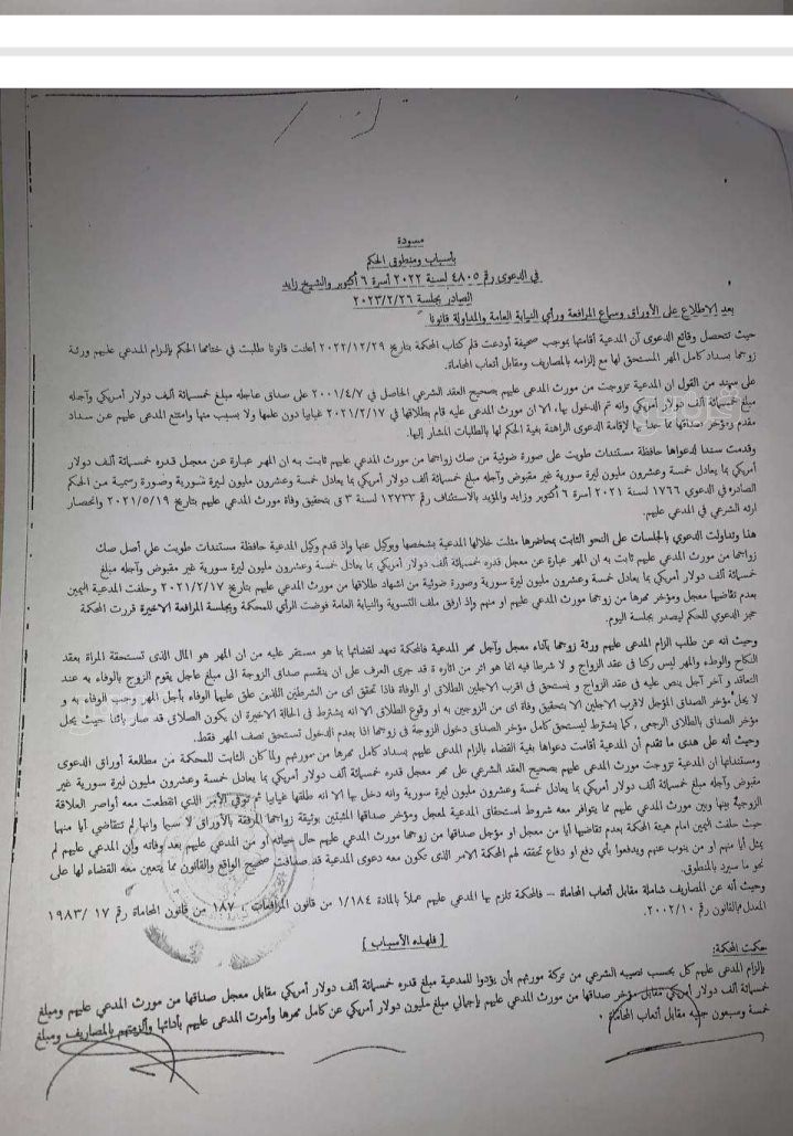وكشفت ستنداتها أن المدعية تزوجت مورث المدعى علي صحيح العقد الشرعي على مهر معجل قدره خمسيئة ألف دولار أمريكي بما يعادل خمسة وعشرون مليون ليرة سورية غير مقبوض وآجله مبلغ خمسمائة ألف دولار أمريكي بما يعادل خمسة وعشرون مليون ليرة سورية ودخل بها إلا انه طلقها غيابيا ثم توفي، الأمر الذي انقطعت معه أواصر العلاقة الزوجية بينها وبين مورث المدعي عليهم كما يتوافر معه شروط استحقاق المدعية المعجل ومؤخر صداقها المثبتين بوثيقة زواجها المرفقة بالأوراق لا سيما وانها لم تتقاضي أيا منها حيث سلفت البيان امام هيئة المحكمة.