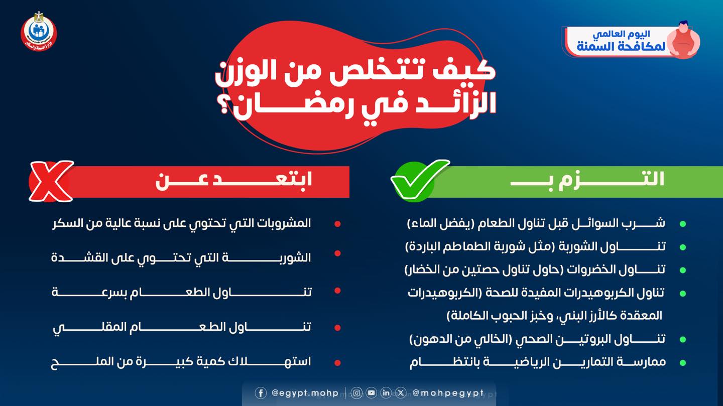 ووجهت وزارة الصحة نصائح للتخلص من الوزن الزائد في شهر رمضان حيث تضمنت بعض المحظورات التي يجب تجنبها منها: