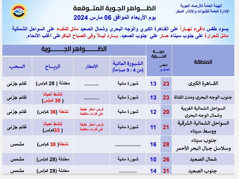 ونشرت هيئة الأرصاد بيانا بدرجات الحرارة المتوقعة اليوم الأربعاء، والتي جاءت كالتالي: